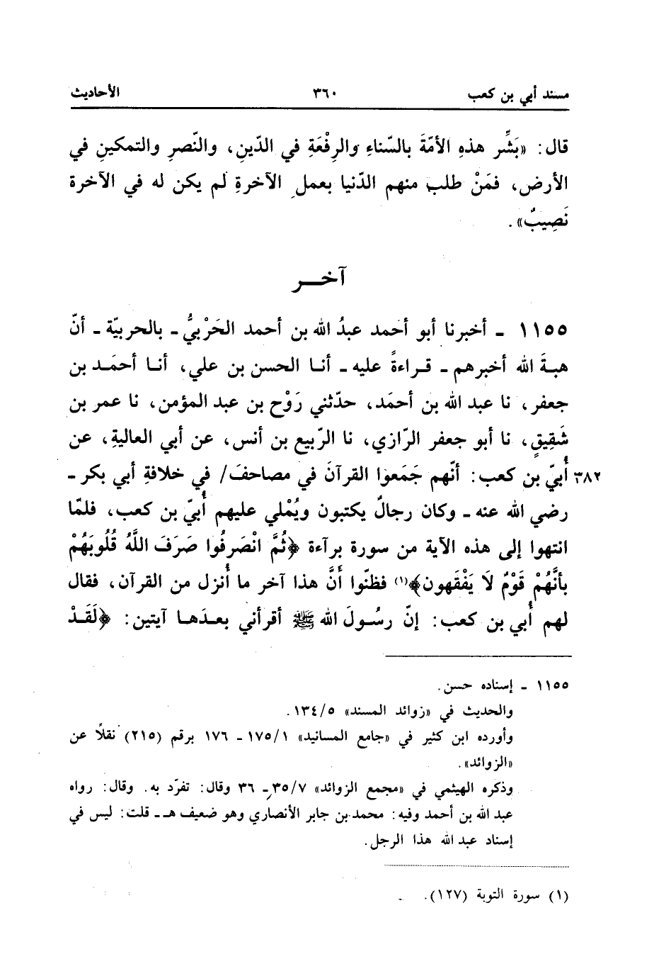 ١١٥٥ - أَخْبَرَنَا أَبُو أَحْمَدَ عَبْدُ اللهِ بْنُ أَحْمَدَ الْحَرْبِيُّ (¬١) بِالْحَرْبِيَّةِ، أَنَّ هِبَةَ اللهِ أَخْبَرَهُمْ قِرَاءَةً عَلَيْهِ، أَنَا الْحَسَنُ بْنُ عَلِيٍّ، أَنَا أَحْمَدُ بْنُ جَعْفَرٍ، نَا عَبْدُ اللهِ بْنُ أَحْمَدَ، حَدَّثَنِي رَوْحُ بْنُ عَبْدِ الْمُؤْمِنِ، نَا عُمَرُ بْنُ شَقِيقٍ، نَا أَبُو جَعْفَرٍ الرَّازِيُّ، نَا الرَّبِيعُ بْنُ أَنَسٍ، عَنْ أَبِي الْعَالِيَةِ، عَنْ أُبَيِّ بْنِ كَعْبٍ: «أَنَّهُمْ جَمَعُوا الْقُرْآنَ فِي مَصَاحِفَ فِي خِلَافَةِ أَبِي بَكْرٍ رَضِيَ اللهُ عَنْهُ، وَكَانَ رِجَالٌ يَكْتُبُونَ وَيُمْلِي عَلَيْهِمْ أُبَيُّ بْنُ كَعْبٍ، فَلَمَّا انْتَهَوْا إِلَى هَذِهِ الْآيَةِ مِنْ سُورَةِ بَرَاءَةٌ: {ثُمَّ انْصَرَفُوا صَرَفَ اللهُ قُلُوبَهُمْ بِأَنَّهُمْ قَوْمٌ لا يَفْقَهُونَ} فَظَنُّوا أَنَّ هَذَا آخِرُ مَا أُنْزِلَ مِنَ الْقُرْآنِ، فَقَالَ لَهُمْ أُبَيُّ بْنُ كَعْبٍ: إِنَّ رَسُولَ اللهِ صَلَّى اللهُ عَلَيْهِ وَسَلَّمَ أَقْرَأَنِي بَعْدَهَا آيَتَيْنِ: