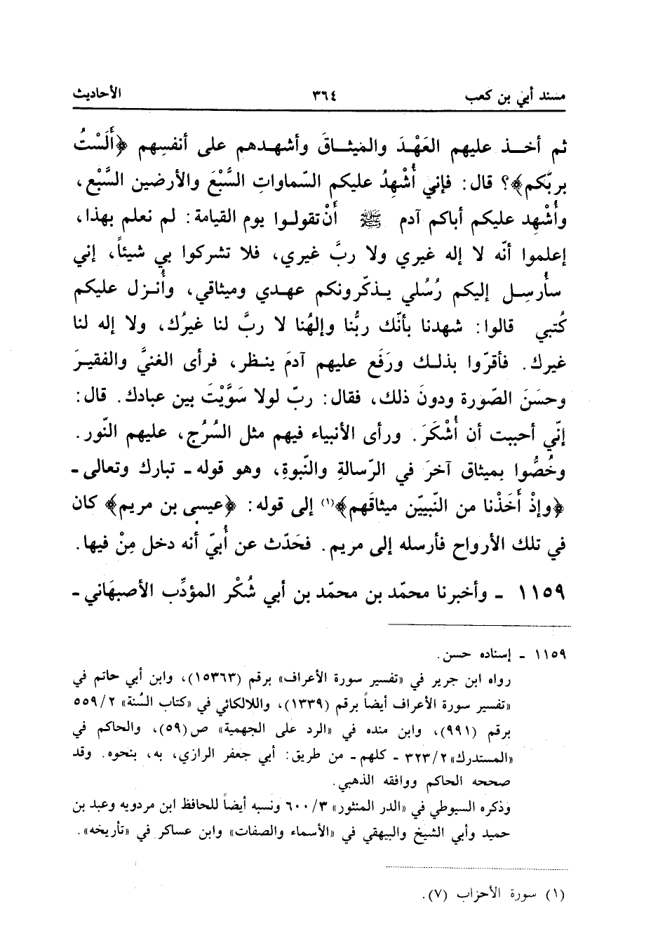 بِهَا أَنَّ مُحَمَّدَ بْنَ رَجَاءِ بْنِ إِبْرَاهِيمَ بْنِ عُمَرَ أَخْبَرَهُمْ قِرَاءَةً عَلَيْهِ، أَنَا أَحْمَدُ بْنُ عَبْدِ الرَّحْمَنِ الذَّكْوَانِيُّ، أَنَا أَبُو بَكْرٍ أَحْمَدُ بْنُ مُوسَى الْحَافِظُ، أَنَا مُحَمَّدُ بْنُ أَحْمَدَ بْنِ إِبْرَاهِيمَ، نَا مُحَمَّدُ بْنُ أَيُّوبَ قَالَ: قَرَأْتُ عَلَى مُحَمَّدِ بْنِ سَعِيدِ بْنِ سَابِقٍ، قَثَنَا أَبُو جَعْفَرٍ الرَّازِيُّ، عَنِ الرَّبِيعِ بْنِ أَنَسٍ، عَنْ أَبِي الْعَالِيَةِ، عَنْ أُبَيِّ بْنِ كَعْبٍ «فِي قَوْلِهِ: {وَإِذْ أَخَذَ رَبُّكَ مِنْ بَنِي آدَمَ مِنْ ظُهُورِهِمْ ذُرِّيَّتَهُمْ وَأَشْهَدَهُمْ عَلَى أَنْفُسِهِمْ أَلَسْتُ بِرَبِّكُمْ قَالُوا بَلَى} إِلَى قَوْلِهِ: {أَفَتُهْلِكُنَا بِمَا فَعَلَ الْمُبْطِلُونَ}.