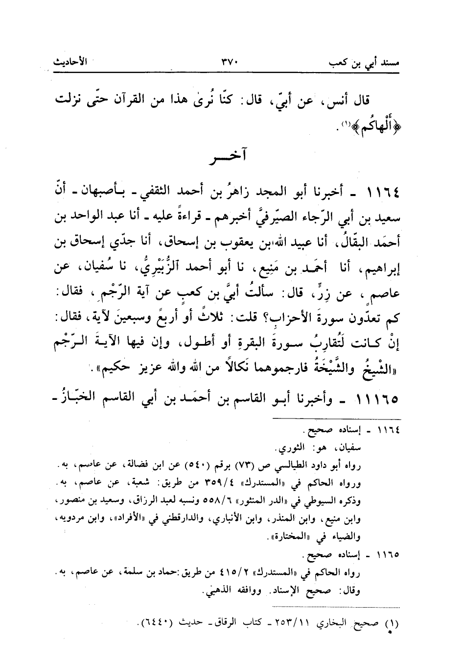 ١١٦٤ - أَخْبَرَنَا أَبُو الْمَجْدِ زَاهِرُ بْنُ أَحْمَدَ الثَّقَفِيُّ بِأَصْبَهَانَ، أَنَّ سَعِيدَ بْنَ أَبِي الرَّجَاءِ الصَّيْرَفِيَّ أَخْبَرَهُمْ قِرَاءَةً عَلَيْهِ، أَنَا عَبْدُ الْوَاحِدِ بْنُ أَحْمَدَ الْبَقَّالُ، أَنَا عُبَيْدُ اللهِ بْنُ يَعْقُوبَ بْنِ إِسْحَاقَ، أَنَا جَدِّي إِسْحَاقُ بْنُ إِبْرَاهِيمَ، أَنَا أَحْمَدُ بْنُ مَنِيعٍ، نَا أَبُو أَحْمَدَ الزُّبَيْرِيُّ، نَا سُفْيَانُ، عَنْ عَاصِمٍ، عَنْ زِرٍّ قَالَ: «سَأَلْتُ أُبَيَّ بْنَ كَعْبٍ عَنْ آيَةِ الرَّجْمِ فَقَالَ: كَمْ تَعُدُّونَ سُورَةَ الْأَحْزَابِ؟ قُلْتُ: ثَلَاثًا أَوْ أَرْبَعًا وَسَبْعِينَ آيَةً، فَقَالَ: إِنْ كَانَتْ لَتُقَارِبُ سُورَةَ الْبَقَرَةِ أَوْ أَطْوَلَ، وَإِنَّ فِيهَا لَآيَةَ الرَّجْمِ: الشَّيْخُ وَالشَّيْخَةُ فَارْجُمُوهُمَا نَكَالًا مِنَ اللهِ وَاللهُ عَزِيزٌ حَكِيمٌ».