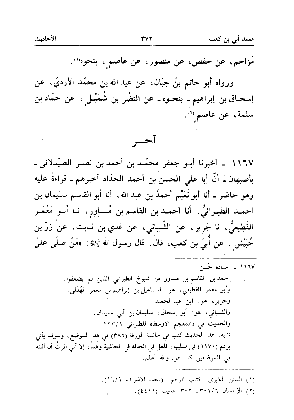 ١١٦٧ - أَخْبَرَنَا أَبُو جَعْفَرٍ مُحَمَّدُ بْنُ أَحْمَدَ بْنِ نَصْرٍ الصَّيْدَلَانِيُّ بِأَصْبَهَانَ، أَنَّ أَبَا عَلِيٍّ الْحَسَنَ بْنَ أَحْمَدَ الْحَدَّادَ أَخْبَرَهُمْ قِرَاءَةً عَلَيْهِ وَهُوَ حَاضِرٌ، أَنَا أَبُو نُعَيْمٍ أَحْمَدُ بْنُ عَبْدِ اللهِ، أَنَا أَبُو الْقَاسِمِ سُلَيْمَانُ بْنُ أَحْمَدَ الطَّبَرَانِيُّ، أَنَا أَحْمَدُ بْنُ الْقَاسِمِ بْنِ مُسَاوِرٍ، نَا أَبُو مَعْمَرٍ الْقَطِيعِيُّ، نَا جَرِيرٌ، عَنِ الشَّيْبَانِيِّ، عَنْ عَدِيِّ بْنِ ثَابِتٍ، عَنْ زِرِّ بْنِ حُبَيْشٍ، عَنْ أُبَيِّ بْنِ كَعْبٍ قَالَ: قَالَ رَسُولُ اللهِ صَلَّى اللهُ عَلَيْهِ وَسَلَّمَ: «مَنْ صَلَّى عَلَى