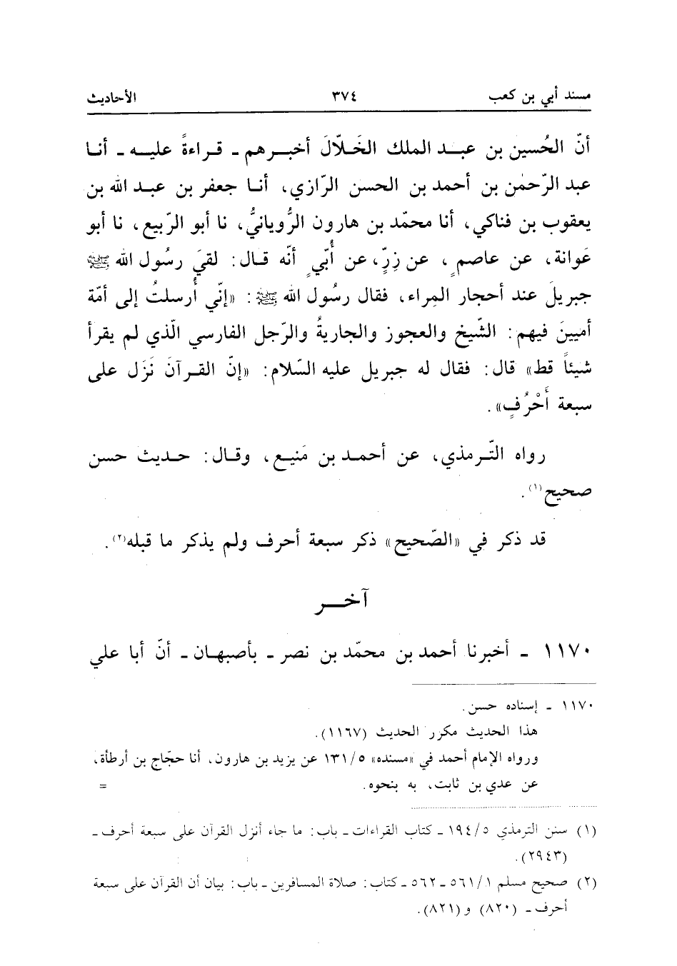 الْحَدَّادَ أَخْبَرَهُمْ وَهُوَ حَاضِرٌ، أَنَا أَبُو نُعَيْمٍ أَحْمَدُ بْنُ عَبْدِ اللهِ، أَنَا سُلَيْمَانُ بْنُ أَحْمَدَ، أَنَا أَحْمَدُ بْنُ الْقَاسِمِ بْنِ مُسَاوِرٍ، نَا أَبُو مَعْمَرٍ الْقَطِيعِيُّ، نَا جَرِيرٌ، عَنِ الشَّيْبَانِيِّ، عَنْ عَدِيِّ بْنِ ثَابِتٍ، عَنْ زِرِّ بْنِ حُبَيْشٍ، عَنْ أُبَيِّ بْنِ كَعْبٍ قَالَ: قَالَ رَسُولُ اللهِ صَلَّى اللهُ عَلَيْهِ وَسَلَّمَ: «مَنْ صَلَّى عَلَى جِنَازَةٍ فَلَهُ قِيرَاطٌ، وَمَنْ شَهِدَهَا حَتَّى تُدْفَنَ فَلَهُ قِيرَاطَانِ، وَمَنْ أَكَلَ مِنْ هَذِهِ الْبَقْلَةِ فَلَا يَقْرَبَنَّ مَسْجِدَنَا».