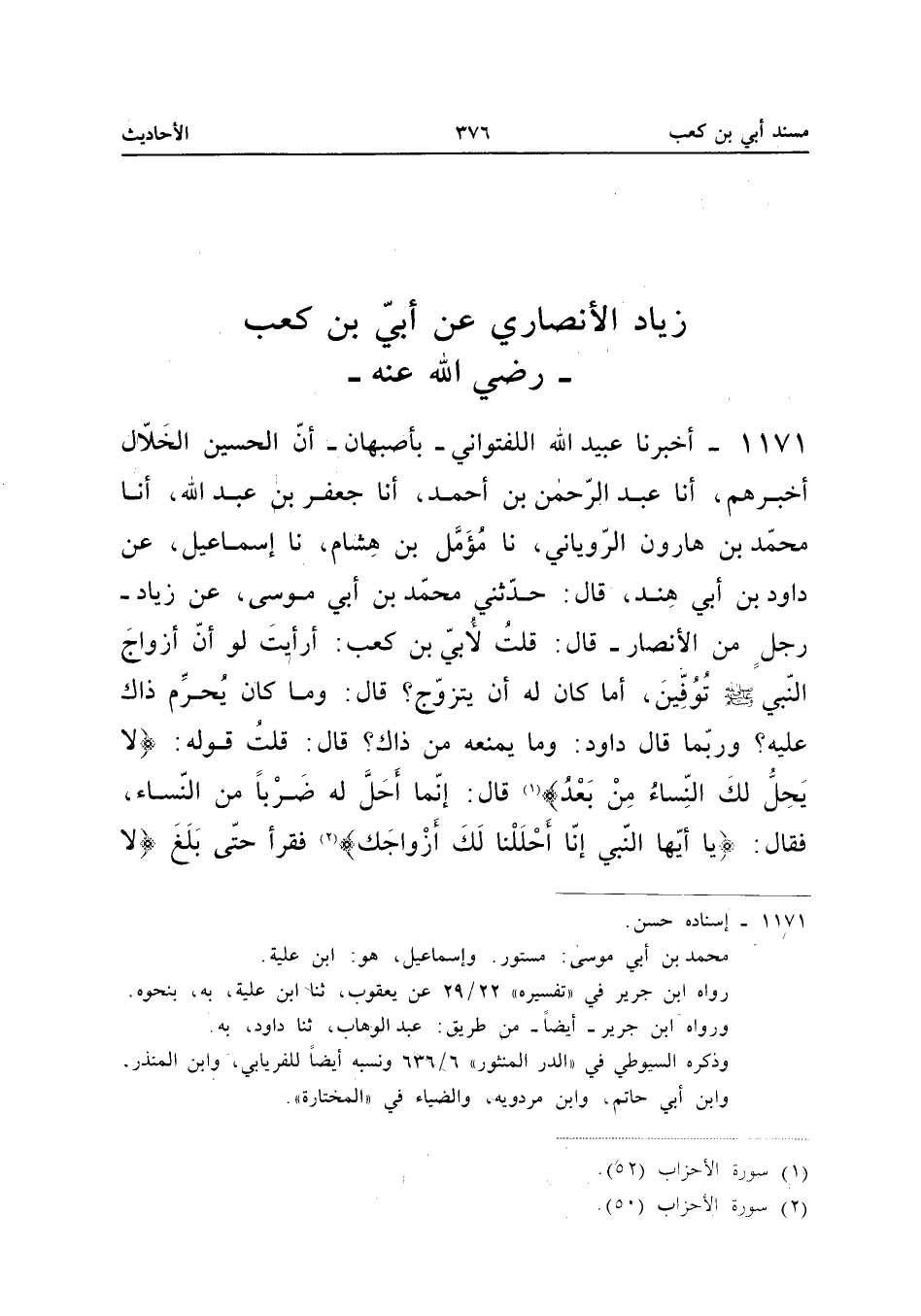 ١١٧١ - أَخْبَرَنَا عُبَيْدُ اللهِ اللَّفْتُوَانِيُّ بِأَصْبَهَانَ، أَنَّ الْحُسَيْنَ الْخَلَّالَ أَخْبَرَهُمْ، أَنَا عَبْدُ الرَّحْمَنِ بْنُ أَحْمَدَ، أَنَا جَعْفَرُ بْنُ عَبْدِ اللهِ، أَنَا مُحَمَّدُ بْنُ هَارُونَ الرُّويَانِيُّ، نَا مُؤَمَّلُ بْنُ هِشَامٍ، نَا إِسْمَاعِيلُ، عَنْ دَاوُدَ بْنِ أَبِي هِنْدٍ قَالَ: حَدَّثَنِي مُحَمَّدُ بْنُ أَبِي مُوسَى، عَنْ زِيَادٍ - رَجُلٍ مِنَ الْأَنْصَارِ - قَالَ: «قُلْتُ لِأُبَيِّ بْنِ كَعْبٍ: أَرَأَيْتَ لَوْ أَنَّ أَزْوَاجَ النَّبِيِّ صَلَّى اللهُ عَلَيْهِ وَسَلَّمَ تُوُفِّينَ، أَمَا كَانَ لَهُ أَنْ يَتَزَوَّجَ؟ قَالَ: وَمَا كَانَ يُحَرِّمُ ذَاكَ عَلَيْهِ؟ وَرُبَّمَا قَالَ دَاوُدُ: وَمَا يَمْنَعُهُ مِنْ ذَاكَ؟ قَالَ: قُلْتُ: قَوْلُهُ: {لا يَحِلُّ لَكَ النِّسَاءُ مِنْ بَعْدُ} قَالَ: إِنَّمَا أَحَلَّ لَهُ ضَرْبًا مِنَ النِّسَاءِ، فَقَالَ: {أَيُّهَا النَّبِيُّ إِنَّا أَحْلَلْنَا لَكَ أَزْوَاجَكَ} فَقَرَأَ حَتَّى بَلَغَ