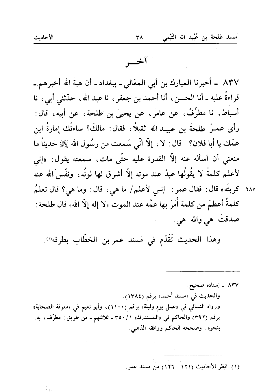 ٨٣٧ - أَخْبَرَنَا الْمُبَارَكُ بْنُ أَبِي الْمَعَالِي بِبَغْدَادَ أَنَّ هِبَةَ اللهِ أَخْبَرَهُمْ قِرَاءَةً عَلَيْهِ، أَنَا الْحَسَنُ، أَنَا أَحْمَدُ بْنُ جَعْفَرٍ، نَا عَبْدُ اللهِ، حَدَّثَنِي أَبِي، نَا أَسْبَاطٌ، نَا مُطَرِّفٌ، عَنْ عَامِرٍ، عَنْ يَحْيَى بْنِ طَلْحَةَ، عَنْ أَبِيهِ قَالَ «رَأَى عُمَرُ طَلْحَةَ بْنَ عُبَيْدِ اللهِ ثَقِيلًا فَقَالَ: مَا لَكَ، سَاءَتْكَ إِمَارَةُ ابْنِ عَمِّكَ يَا أَبَا فُلَانٍ؟ قَالَ: لَا، إِلَّا أَنِّي سَمِعْتُ مِنْ رَسُولِ اللهِ صَلَّى اللهُ عَلَيْهِ وَسَلَّمَ حَدِيثًا مَا مَنَعَنِي أَنْ أَسْأَلَهُ عَنْهُ إِلَّا الْقُدْرَةُ عَلَيْهِ حَتَّى مَاتَ، سَمِعْتُهُ يَقُولُ: إِنِّي لَأَعْلَمُ كَلِمَةً لَا يَقُولُهَا عَبْدٌ عِنْدَ مَوْتِهِ إِلَّا أَشْرَقَ لَهَا لَوْنُهُ، وَنَفَّسَ اللهُ عَنْهُ كُرْبَتَهُ، قَالَ: فَقَالَ عُمَرُ: إِنِّي لَأَعْلَمُ مَا هِيَ، قَالَ: وَمَا هِيَ؟ قَالَ: تَعْلَمُ كَلِمَةً أَعْظَمَ مِنْ كَلِمَةٍ أَمَرَ بِهَا عَمَّهُ عِنْدَ الْمَوْتِ لَا إِلَهَ إِلَّا اللهُ قَالَ طَلْحَةُ: صَدَقْتَ، هِيَ وَاللهِ هِيَ».