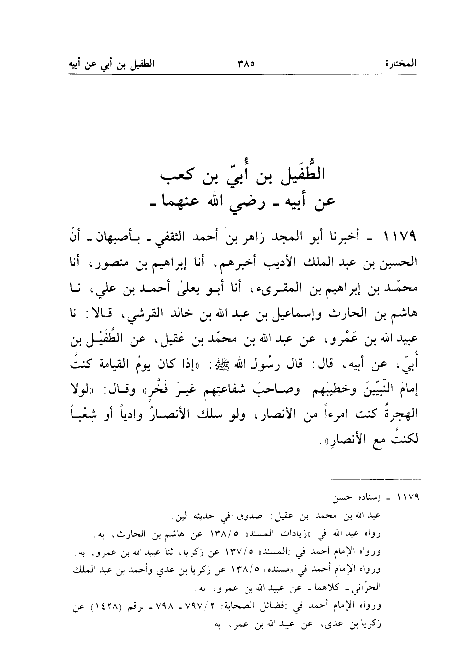 ١١٧٩ - أَخْبَرَنَا أَبُو الْمَجْدِ زَاهِرُ بْنُ أَحْمَدَ الثَّقَفِيُّ بِأَصْبَهَانَ، أَنَّ الْحُسَيْنَ بْنَ عَبْدِ الْمَلِكِ الْأَدِيبَ أَخْبَرَهُمْ، أَنَا إِبْرَاهِيمُ بْنُ مَنْصُورٍ، أَنَا مُحَمَّدُ بْنُ إِبْرَاهِيمَ بْنِ الْمُقْرِئِ، أَنَا أَبُو يَعْلَى أَحْمَدُ بْنُ عَلِيٍّ، نَا هَاشِمُ بْنُ الْحَارِثِ وَإِسْمَاعِيلُ بْنُ عَبْدِ اللهِ بْنِ خَالِدٍ الْقُرَشِيُّ قَالَا: نَا عُبَيْدُ اللهِ بْنُ عَمْرٍو، عَنْ عَبْدِ اللهِ بْنِ مُحَمَّدِ بْنِ عَقِيلٍ، عَنِ الطُّفَيْلِ بْنِ أُبَيٍّ، عَنْ أَبِيهِ قَالَ: قَالَ رَسُولُ اللهِ صَلَّى اللهُ عَلَيْهِ وَسَلَّمَ: «إِذَا كَانَ يَوْمُ الْقِيَامَةِ كُنْتُ إِمَامَ النَّبِيِّينَ وَخَطِيبَهُمْ وَصَاحِبَ شَفَاعَتِهِمْ غَيْرَ فَخْرٍ، وَقَالَ: لَوْلَا الْهِجْرَةُ كُنْتُ امْرَءًا مِنَ الْأَنْصَارِ، وَلَوْ سَلَكَ الْأَنْصَارُ وَادِيًا أَوْ شِعْبًا لَكُنْتُ مَعَ الْأَنْصَارِ».