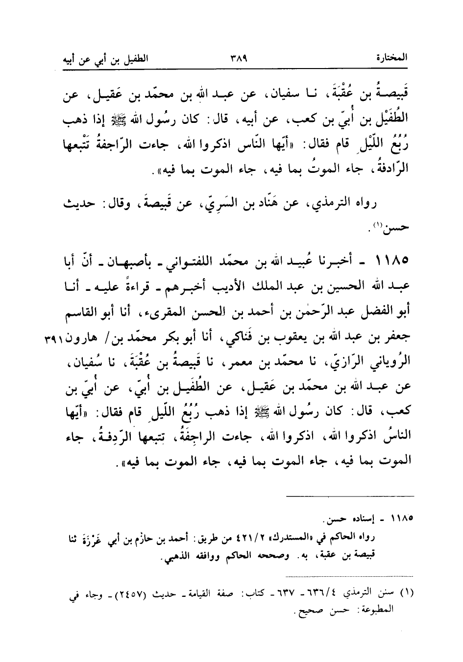 ١١٨٥ - أَخْبَرَنَا عُبَيْدُ اللهِ بْنُ مُحَمَّدٍ اللَّفْتُوَانِيُّ بِأَصْبَهَانَ، أَنَّ أَبَا عَبْدِ اللهِ الْحُسَيْنَ بْنَ عَبْدِ الْمَلِكِ الْأَدِيبَ أَخْبَرَهُمْ قِرَاءَةً عَلَيْهِ، أَنَا أَبُو الْفَضْلِ عَبْدُ الرَّحْمَنِ بْنُ أَحْمَدَ بْنِ الْحَسَنِ الْمُقْرِئُ، أَنَا أَبُو الْقَاسِمِ جَعْفَرُ بْنُ عَبْدِ اللهِ بْنِ يَعْقُوبَ بْنِ فَنَّاكِيٍّ، أَنَا أَبُو بَكْرٍ مُحَمَّدُ بْنُ هَارُونَ الرُّويَانِيُّ الرَّازِيُّ، نَا مُحَمَّدُ بْنُ مَعْمَرٍ، نَا قَبِيصَةُ بْنُ عُقْبَةَ، نَا سُفْيَانُ، عَنْ عَبْدِ اللهِ بْنِ مُحَمَّدِ بْنِ عَقِيلٍ، عَنِ الطُّفَيْلِ بْنِ أُبَيٍّ، عَنْ أُبَيِّ بْنِ كَعْبٍ قَالَ: «كَانَ رَسُولُ اللهِ صَلَّى اللهُ عَلَيْهِ وَسَلَّمَ إِذَا ذَهَبَ رُبُعُ اللَّيْلِ قَامَ فَقَالَ: أَيُّهَا النَّاسُ اذْكُرُوا اللهَ، اذْكُرُوا اللهَ، جَاءَتِ الرَّاجِفَةُ تَتْبَعُهَا الرَّادِفَةُ، جَاءَ الْمَوْتُ بِمَا فِيهِ، جَاءَ الْمَوْتُ بِمَا فِيهِ، جَاءَ الْمَوْتُ بِمَا فِيهِ.
