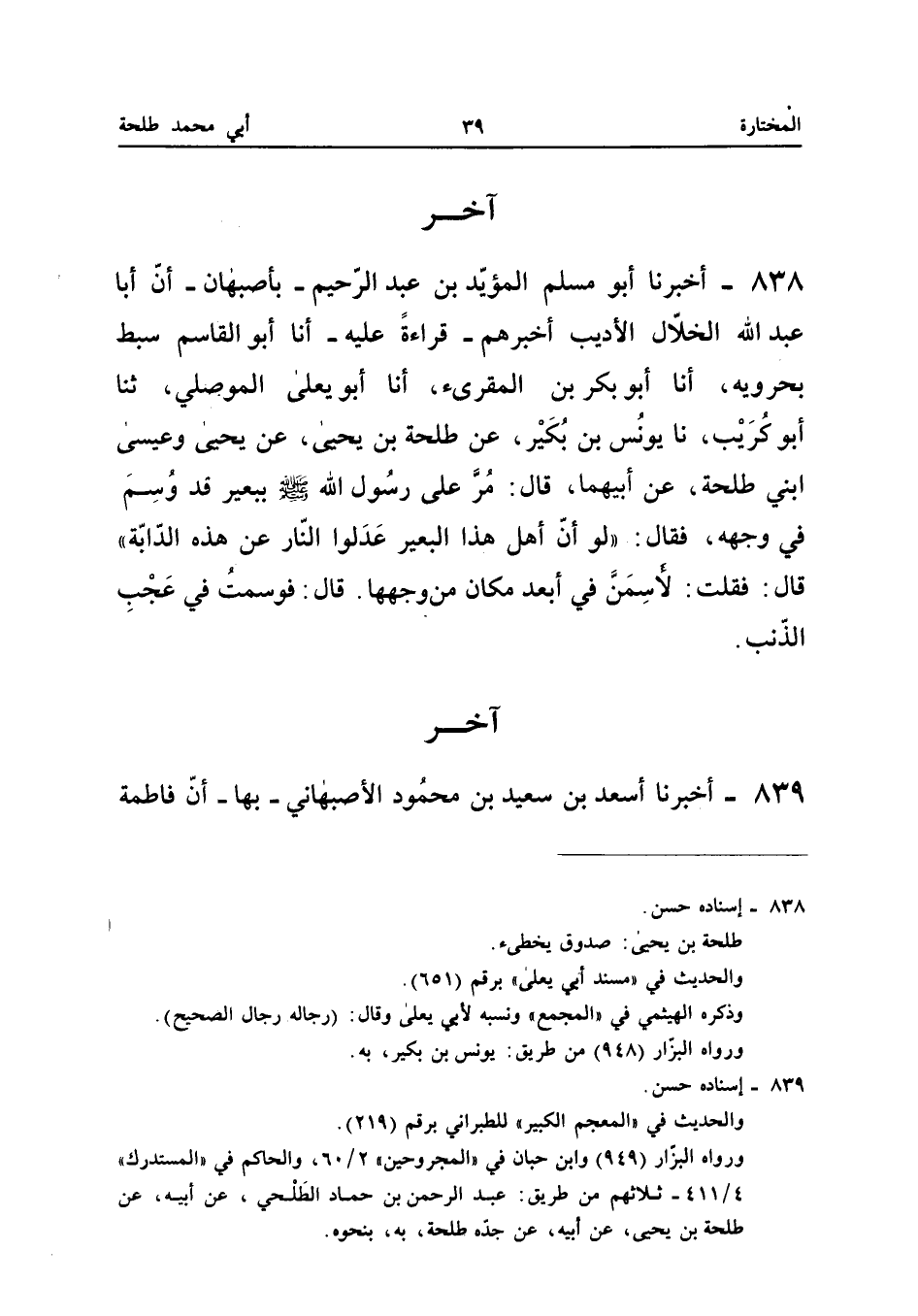 ٨٣٨ - أَخْبَرَنَا أَبُو مُسْلِمٍ الْمُؤَيَّدُ بْنُ عَبْدِ الرَّحِيمِ بِأَصْبَهَانَ، أَنَّ أَبَا عَبْدِ اللهِ الْخَلَّالَ الْأَدِيبَ أَخْبَرَهُمْ قِرَاءَةً عَلَيْهِ، أَنَا أَبُو الْقَاسِمِ سِبْطُ بَحْرَوَيْهِ، أَنَا أَبُو بَكْرِ بْنُ الْمُقْرِئِ، أَنَا أَبُو يَعْلَى الْمَوْصِلِيُّ، ثَنَا أَبُو كُرَيْبٍ، نَا يُونُسُ بْنُ بُكَيْرٍ، عَنْ طَلْحَةَ بْنِ يَحْيَى، عَنْ يَحْيَى وَعِيسَى ابْنَيْ طَلْحَةَ، عَنْ أَبِيهِمَا، قَالَ: «مُرَّ عَلَى رَسُولِ اللهِ صَلَّى اللهُ عَلَيْهِ وَسَلَّمَ بِبَعِيرٍ قَدْ وُسِمَ فِي وَجْهِهِ، فَقَالَ: لَوْ أَنَّ أَهْلَ هَذَا الْبَعِيرِ عَدَلُوا النَّارَ عَنْ هَذِهِ الدَّابَّةِ، قَالَ: فَقُلْتُ: لَأَسِمَنَّ فِي أَبْعَدِ مَكَانٍ مِنْ وَجْهِهَا، قَالَ: فَوَسَمْتُ فِي عَجْبِ الذَّنَبِ».