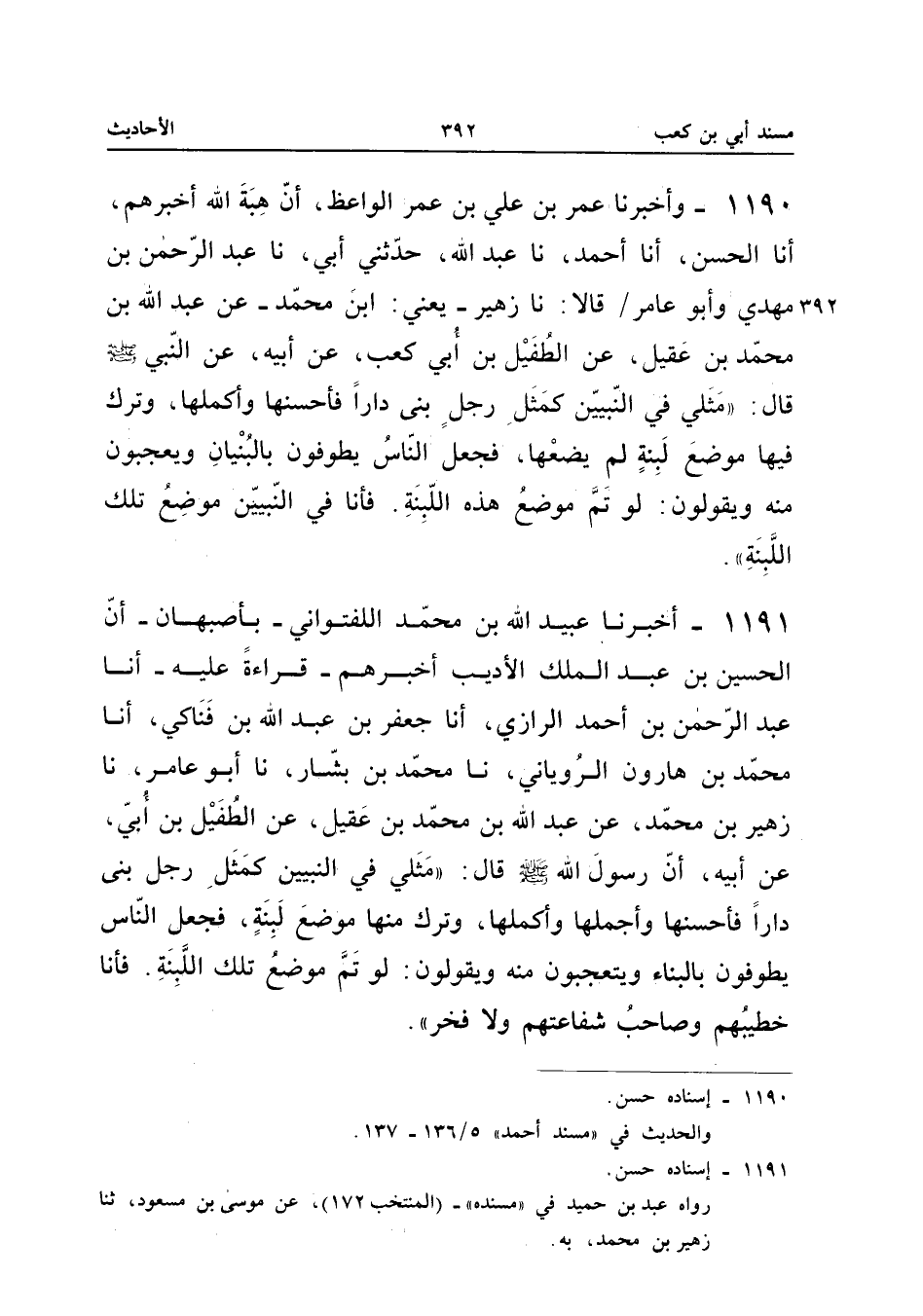 ١١٩٠ - وَأَخْبَرَنَا عُمَرُ بْنُ عَلِيِّ بْنِ عُمَرَ الْوَاعِظُ، أَنَّ هِبَةَ اللهِ أَخْبَرَهُمْ، أَنَا الْحَسَنُ، أَنَا أَحْمَدُ، نَا عَبْدُ اللهِ، حَدَّثَنِي أَبِي، نَا عَبْدُ الرَّحْمَنِ بْنُ مَهْدِيٍّ وَأَبُو عَامِرٍ قَالَا: نَا زُهَيْرٌ - يَعْنِي: ابْنَ مُحَمَّدٍ -، عَنْ عَبْدِ اللهِ بْنِ مُحَمَّدِ بْنِ عَقِيلٍ، عَنِ الطُّفَيْلِ بْنِ أُبَيِّ بْنِ كَعْبٍ، عَنْ أَبِيهِ، عَنِ النَّبِيِّ صَلَّى اللهُ عَلَيْهِ وَسَلَّمَ قَالَ: «مَثَلِي فِي النَّبِيِّينَ كَمَثَلِ رَجُلٍ بَنَى دَارًا فَأَحْسَنَهَا وَأَكْمَلَهَا، وَتَرَكَ فِيهَا مَوْضِعَ لَبِنَةٍ لَمْ يَضَعْهَا، فَجَعَلَ النَّاسُ يَطُوفُونَ بِالْبُنْيَانِ، وَيَعْجَبُونَ مِنْهُ وَيَقُولُونَ: لَوْ تَمَّ مَوْضِعُ هَذِهِ اللَّبِنَةِ، فَأَنَا فِي النَّبِيِّينَ مَوْضِعُ تِلْكَ اللَّبِنَةِ».