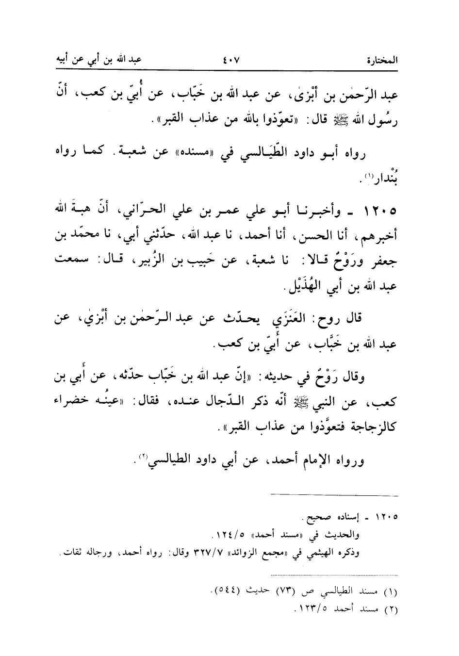 ١٢٠٥ - وَأَخْبَرَنَا أَبُو عَلِيٍّ عُمَرُ بْنُ عَلِيٍّ الْحَرَّانِيُّ، أَنَّ هِبَةَ اللهِ أَخْبَرَهُمْ، أَنَا الْحَسَنُ، أَنَا أَحْمَدُ، نَا عَبْدُ اللهِ، حَدَّثَنِي أَبِي، نَا مُحَمَّدُ بْنُ جَعْفَرٍ وَرَوْحٌ قَالَا: نَا شُعْبَةُ، عَنْ حَبِيبِ بْنِ الزُّبَيْرِ، قَالَ: سَمِعْتُ عَبْدَ اللهِ بْنَ أَبِي الْهُذَيْلِ.