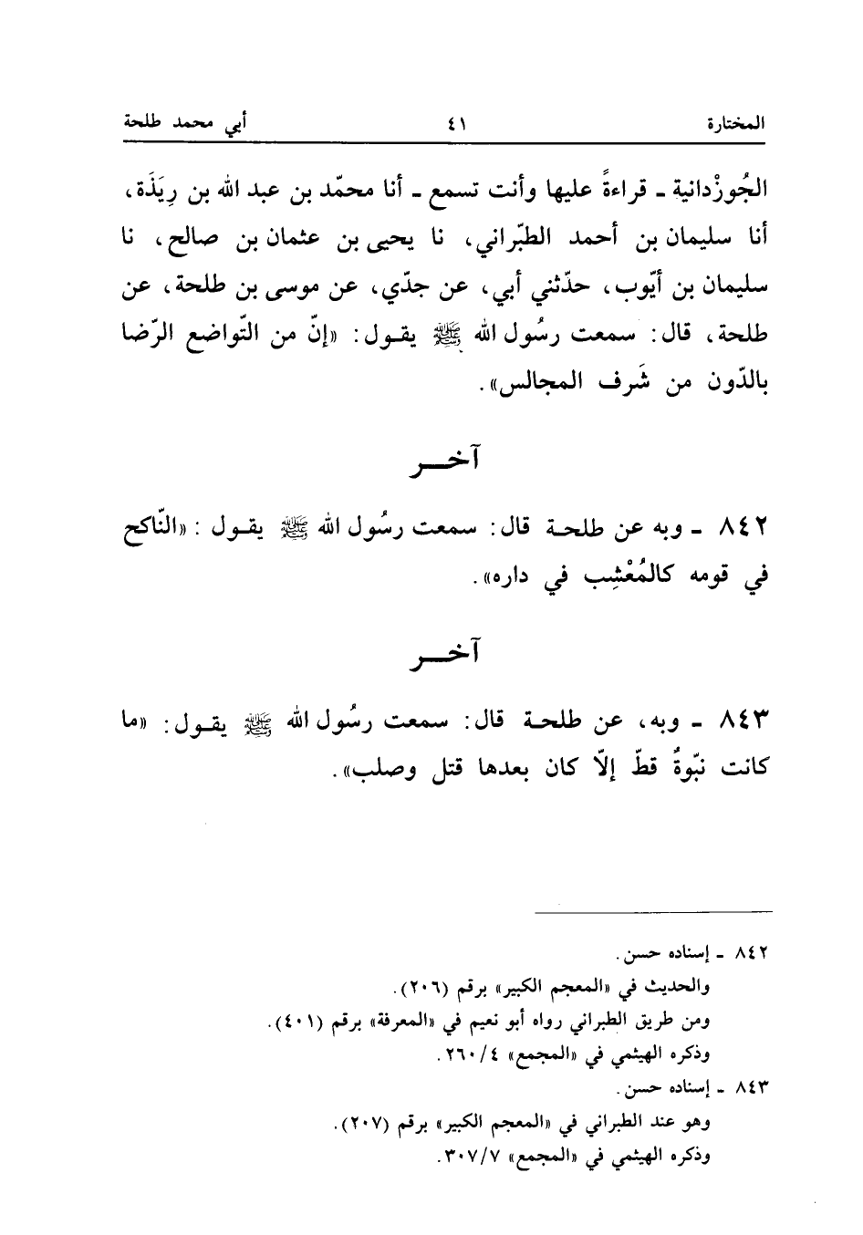 ٨٤٣ - وَبِهِ، عَنْ طَلْحَةَ قَالَ: سَمِعْتُ رَسُولَ اللهِ صَلَّى اللهُ عَلَيْهِ وَسَلَّمَ يَقُولُ: «مَا كَانَتْ نُبُوَّةٌ قَطُّ إِلَّا كَانَ بَعْدَهَا قَتْلٌ وَصَلْبٌ».