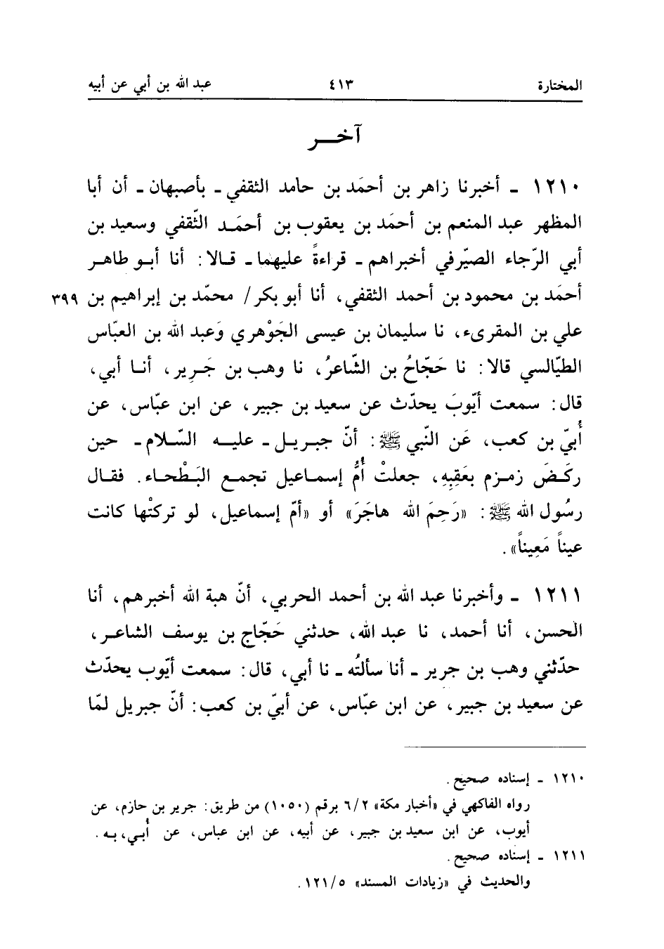 ١٢١٠ - أَخْبَرَنَا زَاهِرُ بْنُ أَحْمَدَ بْنِ حَامِدٍ الثَّقَفِيُّ بِأَصْبَهَانَ، أَنَّ أَبَا الْمُظَهَّرِ عَبْدَ الْمُنْعِمِ بْنَ أَحْمَدَ (¬١) بْنِ يَعْقُوبَ بْنِ أَحْمَدَ الثَّقَفِيَّ وَسَعِيدَ بْنَ أَبِي الرَّجَاءِ الصَّيْرَفِيَّ أَخْبَرَاهُمْ قِرَاءَةً عَلَيْهِمَا، قَالَا: أَنَا أَبُو طَاهِرٍ أَحْمَدُ بْنُ مَحْمُودِ بْنِ أَحْمَدَ الثَّقَفِيُّ، أَنَا أَبُو بَكْرٍ مُحَمَّدُ بْنُ إِبْرَاهِيمَ بْنِ عَلِيِّ بْنِ الْمُقْرِئِ، نَا سُلَيْمَانُ بْنُ عِيسَى الْجَوْهَرِيُّ وَعَبْدُ اللهِ بْنُ الْعَبَّاسِ الطَّيَالِسِيُّ قَالَا: نَا حَجَّاجُ بْنُ الشَّاعِرِ، نَا وَهْبُ بْنُ جَرِيرٍ، أَنَا أَبِي، قَالَ: سَمِعْتُ أَيُّوبَ يُحَدِّثُ، عَنْ سَعِيدِ بْنِ جُبَيْرٍ، عَنِ ابْنِ عَبَّاسٍ، عَنْ أُبَيِّ بْنِ كَعْبٍ، عَنِ النَّبِيِّ صَلَّى اللهُ عَلَيْهِ وَسَلَّمَ «أَنَّ جِبْرِيلَ عَلَيْهِ السَّلَامُ حِينَ رَكَضَ زَمْزَمَ بِعَقِبِهِ جَعَلَتْ أُمُّ إِسْمَاعِيلَ تَجْمَعُ الْبَطْحَاءَ، فَقَالَ رَسُولُ اللهِ صَلَّى اللهُ عَلَيْهِ وَسَلَّمَ: رَحِمَ اللهُ هَاجَرَ - أَوْ أُمَّ إِسْمَاعِيلَ - لَوْ تَرَكَتْهَا كَانَتْ عَيْنًا مَعِينًا».