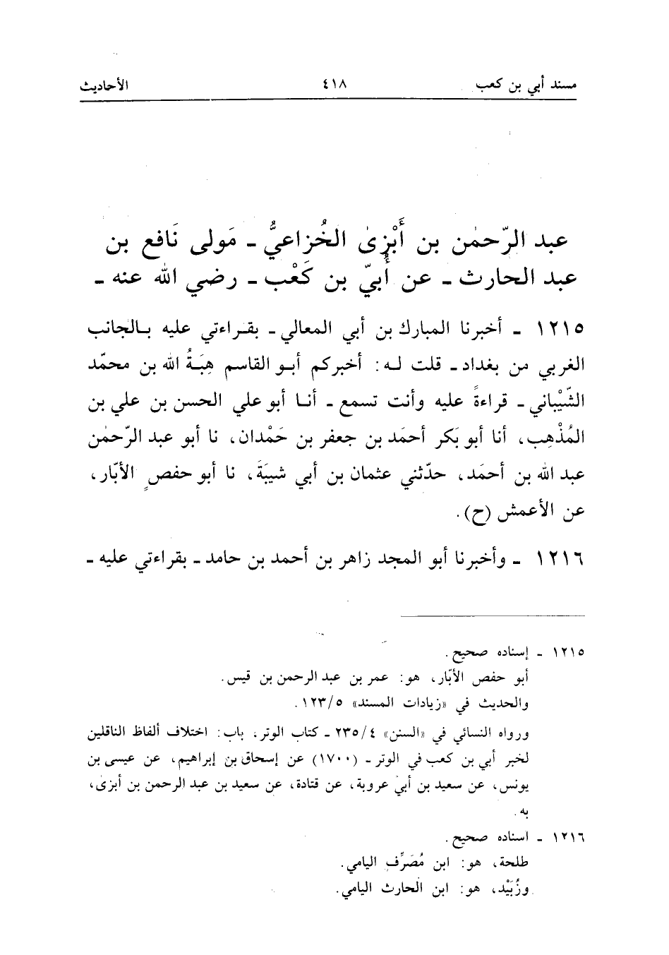 ١٢١٥ - أَخْبَرَنَا الْمُبَارَكُ بْنُ أَبِي الْمَعَالِي بِقِرَاءَتِي عَلَيْهِ بِالْجَانِبِ الْغَرْبِيِّ مِنْ بَغْدَادَ، قُلْتُ لَهُ: أَخْبَرَكُمْ أَبُو الْقَاسِمِ هِبَةُ اللهِ بْنُ مُحَمَّدٍ الشَّيْبَانِيُّ قِرَاءَةً عَلَيْهِ وَأَنْتَ تَسْمَعُ، أَنَا أَبُو عَلِيٍّ الْحَسَنُ بْنُ عَلِيِّ بْنِ الْمُذْهِبِ، أَنَا أَبُو بَكْرٍ أَحْمَدُ بْنُ جَعْفَرِ بْنِ حَمْدَانَ، نَا أَبُو عَبْدِ الرَّحْمَنِ عَبْدُ اللهِ بْنُ أَحْمَدَ، حَدَّثَنِي عُثْمَانُ بْنُ أَبِي شَيْبَةَ، نَا أَبُو حَفْصٍ الْأَبَّارُ، عَنِ الْأَعْمَشِ (ح).