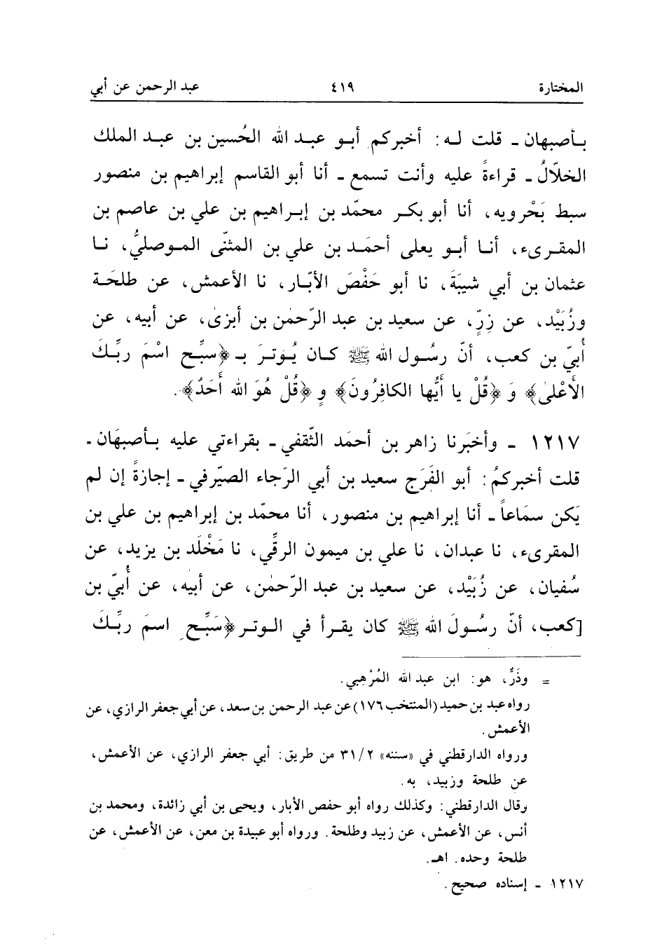 ١٢١٧ - وَأَخْبَرَنَا زَاهِرُ بْنُ أَحْمَدَ الثَّقَفِيُّ بِقِرَاءَتِي عَلَيْهِ بِأَصْبَهَانَ، قُلْتُ: أَخْبَرَكُمْ أَبُو الْفَرَجِ سَعِيدُ بْنُ أَبِي الرَّجَاءِ الصَّيْرَفِيُّ - إِجَازَةً إِنْ لَمْ يَكُنْ سَمَاعًا - أَنَا إِبْرَاهِيمُ بْنُ مَنْصُورٍ، أَنَا مُحَمَّدُ بْنُ إِبْرَاهِيمَ بْنِ عَلِيِّ بْنِ الْمُقْرِئِ، نَا عَبْدَانُ، نَا عَلِيُّ بْنُ مَيْمُونٍ الرَّقِّيُّ، نَا مَخْلَدُ بْنُ يَزِيدَ، عَنْ سُفْيَانَ، عَنْ زُبَيْدٍ، عَنْ سَعِيدِ بْنِ عَبْدِ الرَّحْمَنِ، عَنْ أَبِيهِ، عَنْ أُبَيِّ بْنِ كَعْبٍ، أَنَّ رَسُولَ اللهِ صَلَّى اللهُ عَلَيْهِ وَسَلَّمَ «كَانَ يَقْرَأُ فِي الْوَتْرِ {سَبِّحِ اسْمَ رَبِّكَ الْأَعْلَى}