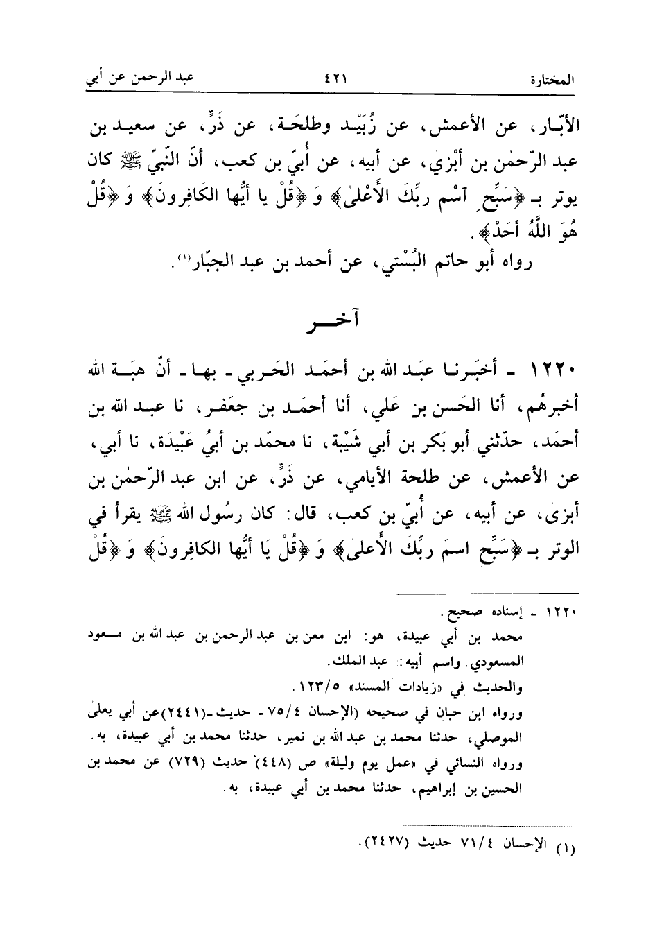 ١٢٢٠ - أَخْبَرَنَا عَبْدُ اللهِ بْنُ أَحْمَدَ الْحَرْبِيُّ بِهَا، أَنَّ هِبَةَ اللهِ أَخْبَرَهُمْ، أَنَا الْحَسَنُ بْنُ عَلِيٍّ، أَنَا أَحْمَدُ بْنُ جَعْفَرٍ، نَا عَبْدُ اللهِ بْنُ أَحْمَدَ، حَدَّثَنِي أَبُو بَكْرِ بْنُ أَبِي شَيْبَةَ، نَا مُحَمَّدُ بْنُ أَبِي عُبَيْدَةَ، نَا أَبِي، عَنِ الْأَعْمَشِ، عَنْ طَلْحَةَ الْإِيَامِيِّ، عَنْ ذَرٍّ، عَنِ ابْنِ عَبْدِ الرَّحْمَنِ بْنِ أَبْزَى، عَنْ أَبِيهِ، عَنْ أُبَيِّ بْنِ كَعْبٍ قَالَ: «كَانَ رَسُولُ اللهِ صَلَّى اللهُ عَلَيْهِ وَسَلَّمَ يَقْرَأُ فِي الْوَتْرِ بِـ {سَبِّحِ اسْمَ رَبِّكَ الْأَعْلَى} وَ {قُلْ يَا أَيُّهَا الْكَافِرُونَ}