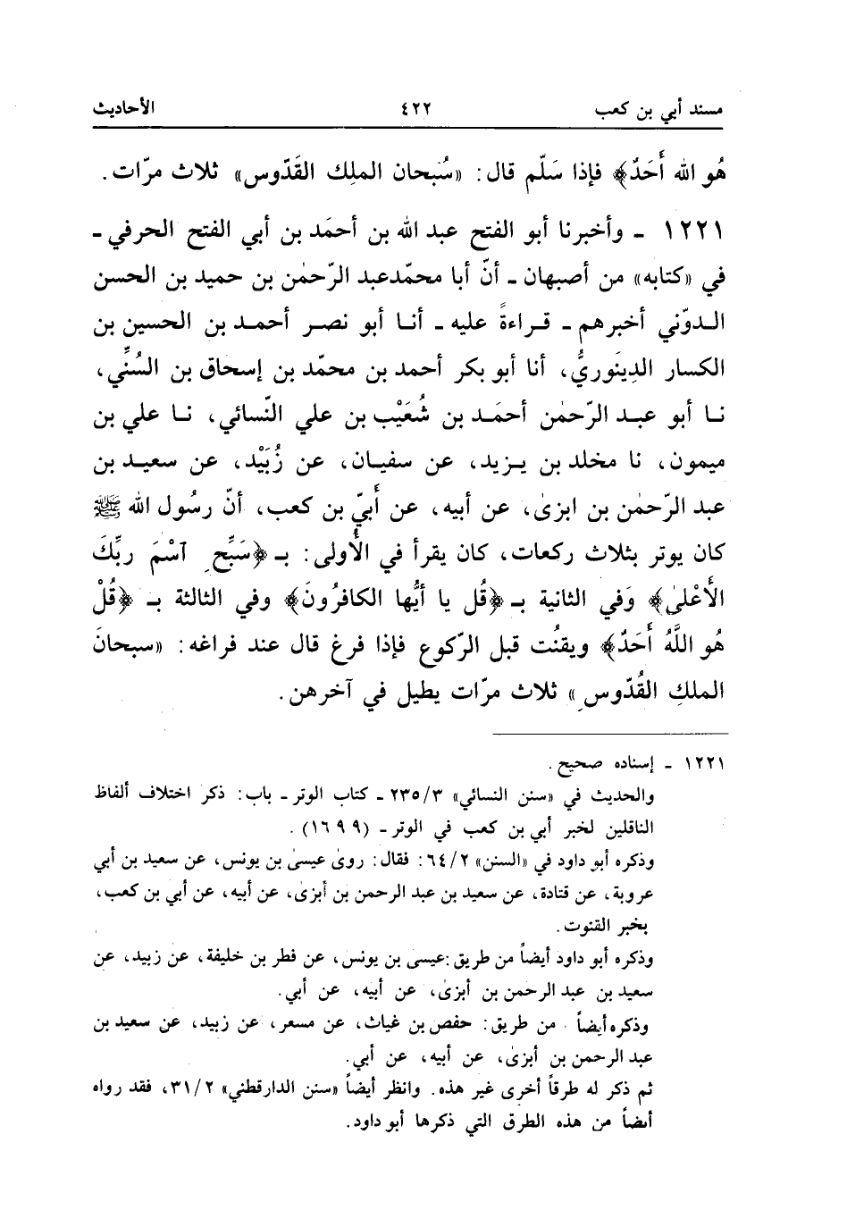 ١٢٢١ - وَأَخْبَرَنَا أَبُو الْفَتْحِ عَبْدُ اللهِ بْنُ أَحْمَدَ بْنِ أَبِي الْفَتْحِ الْحُرْفِيُّ فِي كِتَابِهِ مِنْ أَصْبَهَانَ، أَنَّ أَبَا مُحَمَّدٍ عَبْدَ الرَّحْمَنِ بْنَ حُمَيْدِ بْنِ الْحَسَنِ الدُّونِيَّ أَخْبَرَهُمْ قِرَاءَةً عَلَيْهِ، أَنَا أَبُو نَصْرٍ أَحْمَدُ بْنُ الْحُسَيْنِ بْنِ الْكَسَّارِ الدِّينَوَرِيُّ، أَنَا أَبُو بَكْرٍ أَحْمَدُ بْنُ مُحَمَّدِ بْنِ إِسْحَاقَ بْنِ السُّنِّيِّ، نَا أَبُو عَبْدِ الرَّحْمَنِ أَحْمَدُ بْنُ شُعَيْبِ بْنِ عَلِيٍّ النَّسَائِيُّ، نَا عَلِيُّ بْنُ مَيْمُونٍ، نَا مَخْلَدُ بْنُ يَزِيدَ، عَنْ سُفْيَانَ، عَنْ زُبَيْدٍ، عَنْ سَعِيدِ بْنِ عَبْدِ الرَّحْمَنِ بْنِ أَبْزَى، عَنْ أَبِيهِ، عَنْ أُبَيِّ بْنِ كَعْبٍ، أَنَّ رَسُولَ اللهِ صَلَّى اللهُ عَلَيْهِ وَسَلَّمَ «كَانَ يُوتِرُ بِثَلَاثِ رَكَعَاتٍ، كَانَ يَقْرَأُ فِي الْأُولَى بِـ {سَبِّحِ اسْمَ رَبِّكَ الْأَعْلَى} وَفِي الثَّانِيَةِ بِـ {قُلْ يَا أَيُّهَا الْكَافِرُونَ} وَفِي الثَّالِثَةِ بِـ {قُلْ هُوَ اللهُ أَحَدٌ} وَيَقْنُتُ قَبْلَ الرُّكُوعِ، فَإِذَا فَرَغَ قَالَ عِنْدَ فَرَاغِهِ: سُبْحَانَ الْمَلِكِ الْقُدُّوسِ، ثَلَاثَ مَرَّاتٍ يُطِيلُ فِي آخِرِهِنَّ».