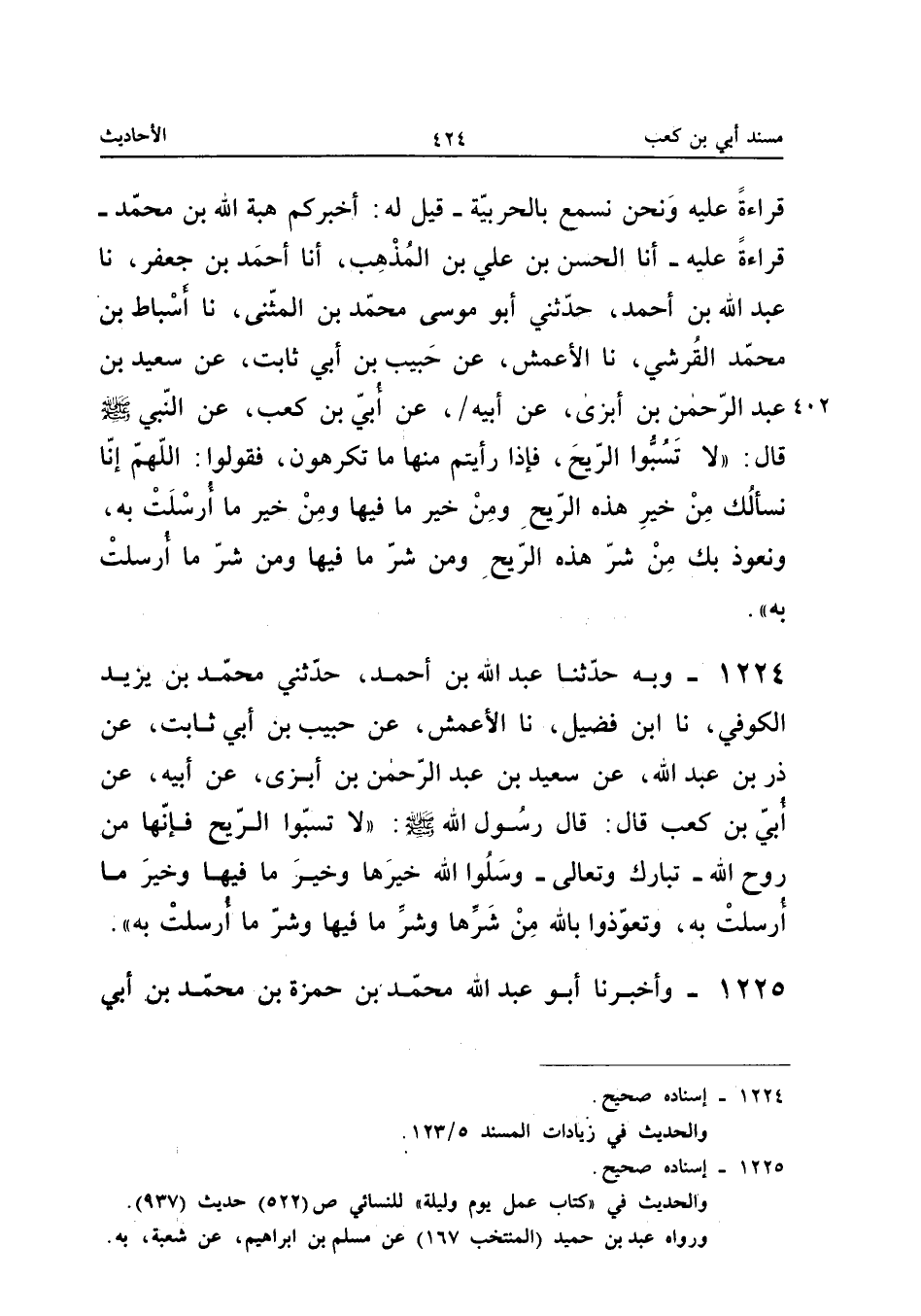 ١٢٢٤ - وَبِهِ حَدَّثَنَا عَبْدُ اللهِ بْنُ أَحْمَدَ، حَدَّثَنِي مُحَمَّدُ بْنُ يَزِيدَ الْكُوفِيُّ، نَا ابْنُ فُضَيْلٍ، نَا الْأَعْمَشُ، عَنْ حَبِيبِ بْنِ أَبِي ثَابِتٍ، عَنْ ذَرِّ بْنِ عَبْدِ اللهِ، عَنْ سَعِيدِ بْنِ عَبْدِ الرَّحْمَنِ بْنِ أَبْزَى، عَنْ أَبِيهِ، عَنْ أُبَيِّ بْنِ كَعْبٍ قَالَ: قَالَ رَسُولُ اللهِ صَلَّى اللهُ عَلَيْهِ وَسَلَّمَ: «لَا تَسُبُّوا الرِّيحَ، فَإِنَّهَا مِنْ رَوْحِ اللهِ تَبَارَكَ وَتَعَالَى، وَسَلُوا اللهَ خَيْرَهَا، وَخَيْرَ مَا فِيهَا، وَخَيْرَ مَا أُرْسِلَتْ بِهِ، وَتَعَوَّذُوا بِاللهِ مِنْ شَرِّهَا، وَشَرِّ مَا فِيهَا، وَشَرِّ مَا أُرْسِلَتْ بِهِ».