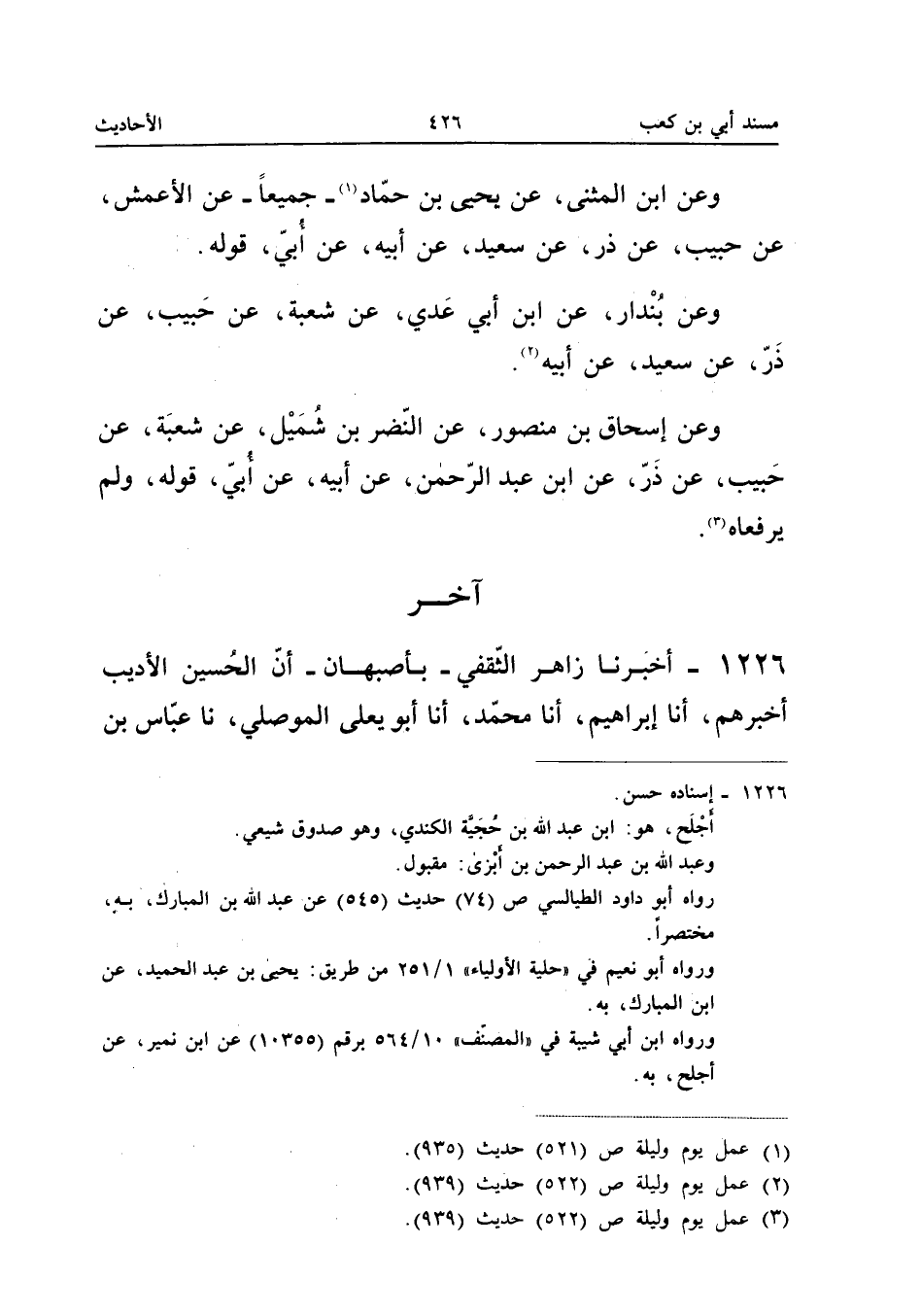 ١٢٢٦ - أَخْبَرَنَا زَاهِرٌ الثَّقَفِيُّ بِأَصْبَهَانَ، أَنَّ الْحُسَيْنَ الْأَدِيبَ أَخْبَرَهُمْ، أَنَا إِبْرَاهِيمُ، أَنَا مُحَمَّدٌ، أَنَا أَبُو يَعْلَى الْمَوْصِلِيُّ، نَا عَبَّاسُ بْنُ