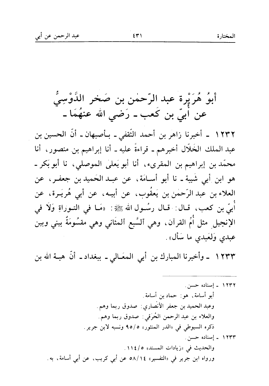 ١٢٣٢ - أَخْبَرَنَا زَاهِرُ بْنُ أَحْمَدَ الثَّقَفِيُّ بِأَصْبَهَانَ، أَنَّ الْحُسَيْنَ بْنَ عَبْدِ الْمَلِكِ الْخَلَّالَ أَخْبَرَهُمْ قِرَاءَةً عَلَيْهِ، أَنَا إِبْرَاهِيمُ بْنُ مَنْصُورٍ، أَنَا مُحَمَّدُ بْنُ إِبْرَاهِيمَ بْنِ الْمُقْرِئِ، أَنَا أَبُو يَعْلَى الْمَوْصِلِيُّ، نَا أَبُو بَكْرٍ - هُوَ ابْنُ أَبِي شَيْبَةَ -، نَا أَبُو أُسَامَةَ، عَنْ عَبْدِ الْحَمِيدِ بْنِ جَعْفَرٍ، عَنِ الْعَلَاءِ بْنِ عَبْدِ الرَّحْمَنِ بْنِ يَعْقُوبَ، عَنْ أَبِيهِ، عَنْ أَبِي هُرَيْرَةَ، عَنْ أُبَيِّ بْنِ كَعْبٍ قَالَ: قَالَ رَسُولُ اللهِ صَلَّى اللهُ عَلَيْهِ وَسَلَّمَ: «مَا فِي التَّوْرَاةِ وَلَا فِي الْإِنْجِيلِ مِثْلُ أُمِّ الْقُرْآنِ، وَهِيَ السَّبْعُ الْمَثَانِي، وَهِيَ مَقْسُومَةٌ بَيْنِي وَبَيْنَ عَبْدِي، وَلِعَبْدِي مَا سَأَلَ».