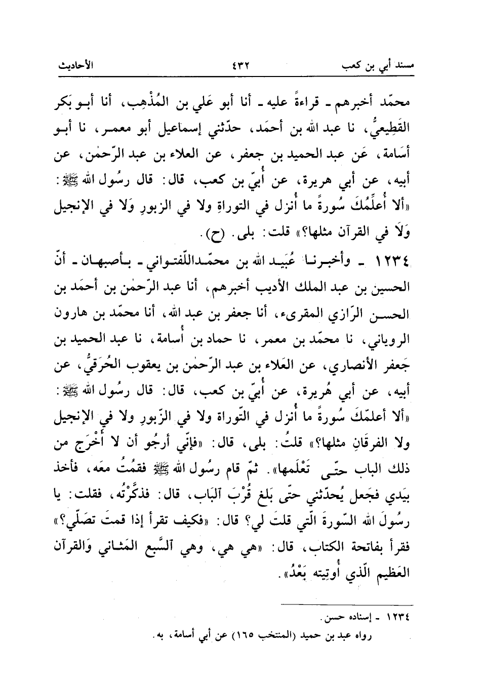١٢٣٤ - وَأَخْبَرَنَا عُبَيْدُ اللهِ بْنُ مُحَمَّدٍ اللَّفْتُوَانِيُّ بِأَصْبَهَانَ، أَنَّ الْحُسَيْنَ بْنَ عَبْدِ الْمَلِكِ الْأَدِيبَ أَخْبَرَهُمْ، أَنَا عَبْدُ الرَّحْمَنِ بْنُ أَحْمَدَ بْنِ الْحَسَنِ الرَّازِيُّ الْمُقْرِئُ، أَنَا جَعْفَرُ بْنُ عَبْدِ اللهِ، أَنَا مُحَمَّدُ بْنُ هَارُونَ الرُّويَانِيُّ، نَا مُحَمَّدُ بْنُ مَعْمَرٍ، نَا حَمَّادُ بْنُ أُسَامَةَ، نَا عَبْدُ الْحَمِيدِ بْنُ جَعْفَرٍ الْأَنْصَارِيُّ، عَنِ الْعَلَاءِ بْنِ عَبْدِ الرَّحْمَنِ بْنِ يَعْقُوبَ الْحُرَقِيِّ، عَنْ أَبِيهِ، عَنْ أَبِي هُرَيْرَةَ، عَنْ أُبَيِّ بْنِ كَعْبٍ قَالَ: قَالَ رَسُولُ اللهِ صَلَّى اللهُ عَلَيْهِ وَسَلَّمَ: «أَلَا أُعَلِّمُكَ سُورَةً مَا أُنْزِلَ فِي التَّوْرَاةِ وَلَا فِي الزَّبُورِ وَلَا فِي الْإِنْجِيلِ وَلَا الْفُرْقَانِ مِثْلُهَا؟ قُلْتُ: بَلَى، قَالَ: فَإِنِّي أَرْجُو أَنْ لَا أَخْرُجَ مِنْ ذَلِكَ الْبَابِ حَتَّى تَعْلَمَهَا، ثُمَّ قَامَ رَسُولُ اللهِ صَلَّى اللهُ عَلَيْهِ وَسَلَّمَ فَقُمْتُ مَعَهُ، فَأَخَذَ بِيَدِي فَجَعَلَ يُحَدِّثُنِي حَتَّى بَلَغَ قُرْبَ الْبَابِ، قَالَ: فَذَكَّرْتُهُ، فَقُلْتُ: يَا رَسُولَ اللهِ السُّورَةَ الَّتِي قُلْتَ لِي، قَالَ: فَكَيْفَ تَقْرَأُ إِذَا قُمْتَ تُصَلِّي؟ فَقَرَأَ بِفَاتِحَةِ الْكِتَابِ، قَالَ: هِيَ هِيَ، وَهِيَ السَّبْعُ الْمَثَانِي وَالْقُرْآنُ الْعَظِيمُ الَّذِي أُوتِيتُهُ بَعْدُ».