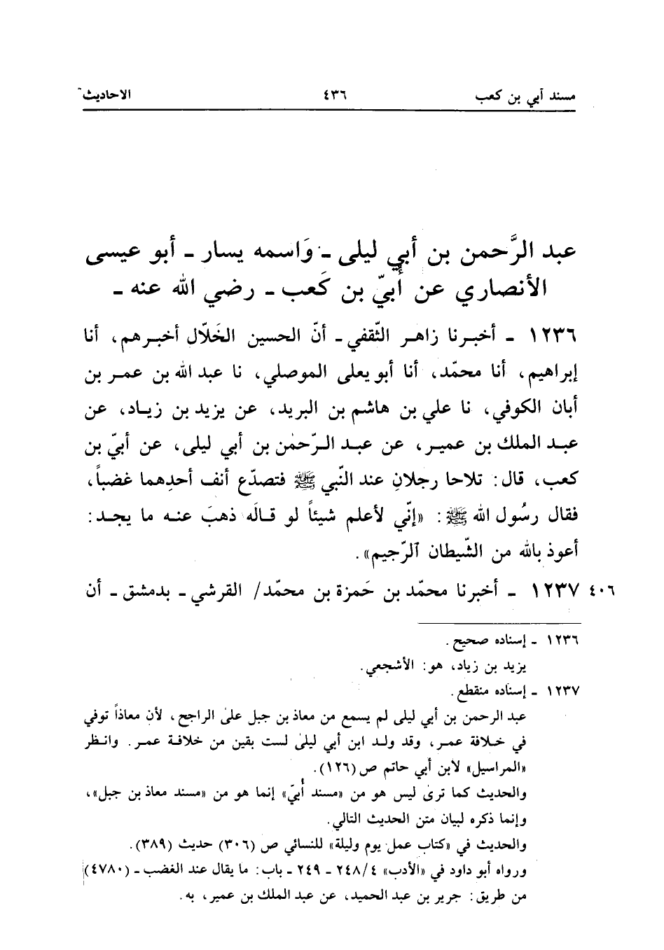 ١٢٣٦ - أَخْبَرَنَا زَاهِرٌ الثَّقَفِيُّ، أَنَّ الْحُسَيْنَ الْخَلَّالَ أَخْبَرَهُمْ، أَنَا إِبْرَاهِيمُ، أَنَا مُحَمَّدٌ، أَنَا أَبُو يَعْلَى الْمَوْصِلِيُّ، نَا عَبْدُ اللهِ بْنُ عُمَرَ بْنِ أَبَانَ الْكُوفِيُّ، نَا عَلِيُّ بْنُ هَاشِمِ بْنِ الْبَرِيدِ، عَنْ يَزِيدَ بْنِ زِيَادٍ، عَنْ عَبْدِ الْمَلِكِ بْنِ عُمَيْرٍ، عَنْ عَبْدِ الرَّحْمَنِ بْنِ أَبِي لَيْلَى، عَنْ أُبَيِّ بْنِ كَعْبٍ قَالَ: «تَلَاحَى رَجُلَانِ عِنْدَ النَّبِيِّ صَلَّى اللهُ عَلَيْهِ وَسَلَّمَ، فَتَصَدَّعَ أَنْفُ أَحَدِهِمَا غَضَبًا، فَقَالَ رَسُولُ اللهِ صَلَّى اللهُ عَلَيْهِ وَسَلَّمَ: إِنِّي لَأَعْلَمُ شَيْئًا لَوْ قَالَهُ ذَهَبَ عَنْهُ مَا يَجِدُ: أَعُوذُ بِاللهِ مِنَ الشَّيْطَانِ الرَّجِيمِ».