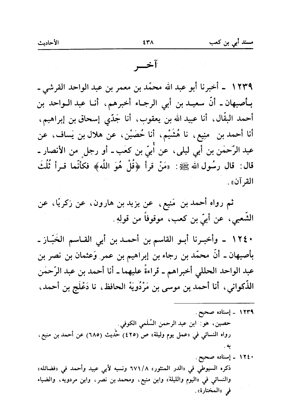 ١٢٣٩ - أَخْبَرَنَا أَبُو عَبْدِ اللهِ مُحَمَّدُ بْنُ مَعْمَرِ بْنِ عَبْدِ الْوَاحِدِ الْقُرَشِيُّ بِأَصْبَهَانَ، أَنَّ سَعِيدَ بْنَ أَبِي الرَّجَاءِ أَخْبَرَهُمْ، أَنَا عَبْدُ الْوَاحِدِ بْنُ أَحْمَدَ الْبَقَّالُ، أَنَا عُبَيْدُ اللهِ بْنُ يَعْقُوبَ، أَنَا جَدِّي إِسْحَاقُ بْنُ إِبْرَاهِيمَ، أَنَا أَحْمَدُ بْنُ مَنِيعٍ، نَا هُشَيْمٌ، أَنَا حُصَيْنٌ، عَنْ هِلَالِ بْنِ يَسَافٍ، عَنْ عَبْدِ الرَّحْمَنِ بْنِ أَبِي لَيْلَى، عَنْ أُبَيِّ بْنِ كَعْبٍ - أَوْ رَجُلٍ مِنَ الْأَنْصَارِ - قَالَ: قَالَ رَسُولُ اللهِ صَلَّى اللهُ عَلَيْهِ وَسَلَّمَ: «مَنْ قَرَأَ {قُلْ هُوَ اللهُ} فَكَأَنَّمَا قَرَأَ ثُلُثَ الْقُرْآنِ».