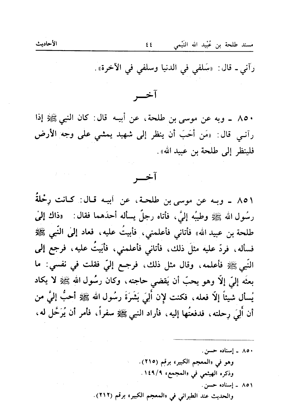 ٨٥٠ - وَبِهِ، عَنْ مُوسَى بْنِ طَلْحَةَ، عَنْ أَبِيهِ، قَالَ: «كَانَ النَّبِيُّ صَلَّى اللهُ عَلَيْهِ وَسَلَّمَ إِذَا رَآنِي قَالَ: مَنْ أَحَبَّ أَنْ يَنْظُرَ إِلَى شَهِيدٍ يَمْشِي عَلَى وَجْهِ الْأَرْضِ فَلْيَنْظُرْ إِلَى طَلْحَةَ بْنِ عُبَيْدِ اللهِ».