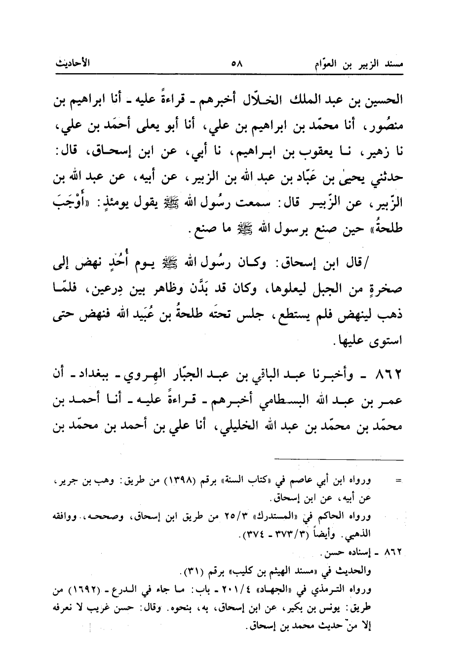 الْحَسَنِ الْخُزَاعِيُّ، أَنَا الْهَيْثَمُ بْنُ كُلَيْبٍ الشَّاشِيُّ، ثَنَا الْعَبَّاسُ الدُّورِيُّ، ثَنَا عَبْدُ اللهِ بْنُ سِنَانٍ الْهَرَوِيُّ، ثَنَا عَبْدُ اللهِ بْنُ الْمُبَارَكِ، عَنْ مُحَمَّدِ بْنِ إِسْحَاقَ، عَنْ يَحْيَى بْنِ عَبَّادٍ، عَنْ أَبِيهِ، عَنْ جَدِّهِ عَبْدِ اللهِ بْنِ الزُّبَيْرِ، عَنِ الزُّبَيْرِ قَالَ: «سَمِعْتُ رَسُولَ اللهِ صَلَّى اللهُ عَلَيْهِ وَسَلَّمَ يَقُولُ يَوْمَئِذٍ: أَوْجَبَ طَلْحَةُ».