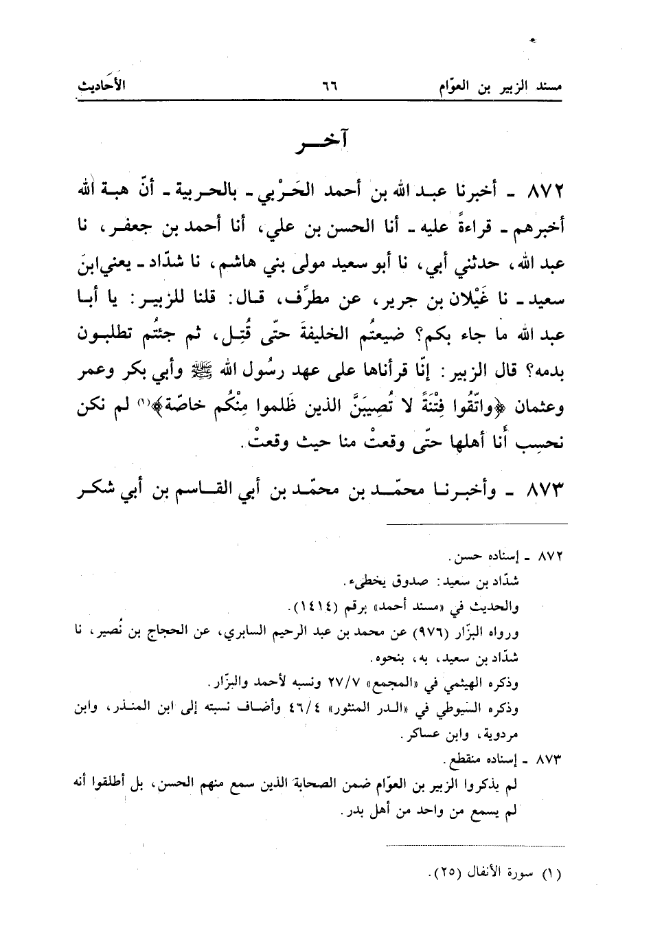 ٨٧٢ - أَخْبَرَنَا عَبْدُ اللهِ بْنُ أَحْمَدَ الْحَرْبِيُّ بِالْحَرْبِيَّةِ، أَنَّ هِبَةَ اللهِ أَخْبَرَهُمْ قِرَاءَةً عَلَيْهِ، أَنَا الْحَسَنُ بْنُ عَلِيٍّ، أَنَا أَحْمَدُ بْنُ جَعْفَرٍ، نَا عَبْدُ اللهِ، حَدَّثَنِي أَبِي، نَا أَبُو سَعِيدٍ مَوْلَى بَنِي هَاشِمٍ، نَا شَدَّادٌ - يَعْنِي: ابْنَ سَعِيدٍ -، نَا غَيْلَانُ بْنُ جَرِيرٍ، عَنْ مُطَرِّفٍ، قَالَ: «قُلْنَا لِلزُّبَيْرِ: يَا أَبَا عَبْدِ اللهِ مَا جَاءَ بِكُمْ؟ ضَيَّعْتُمُ الْخَلِيفَةَ حَتَّى قُتِلَ، ثُمَّ جِئْتُمْ تَطْلُبُونَ بِدَمِهِ، قَالَ الزُّبَيْرُ: إِنَّا قَرَأْنَاهَا عَلَى عَهْدِ رَسُولِ اللهِ صَلَّى اللهُ عَلَيْهِ وَسَلَّمَ وَأَبِي بَكْرٍ وَعُمَرَ وَعُثْمَانَ {وَاتَّقُوا فِتْنَةً لا تُصِيبَنَّ الَّذِينَ ظَلَمُوا مِنْكُمْ خَاصَّةً} لَمْ نَكُنْ نَحْسَبُ أَنَّا أَهْلُهَا حَتَّى وَقَعَتْ مِنَّا حَيْثُ وَقَعَتْ».