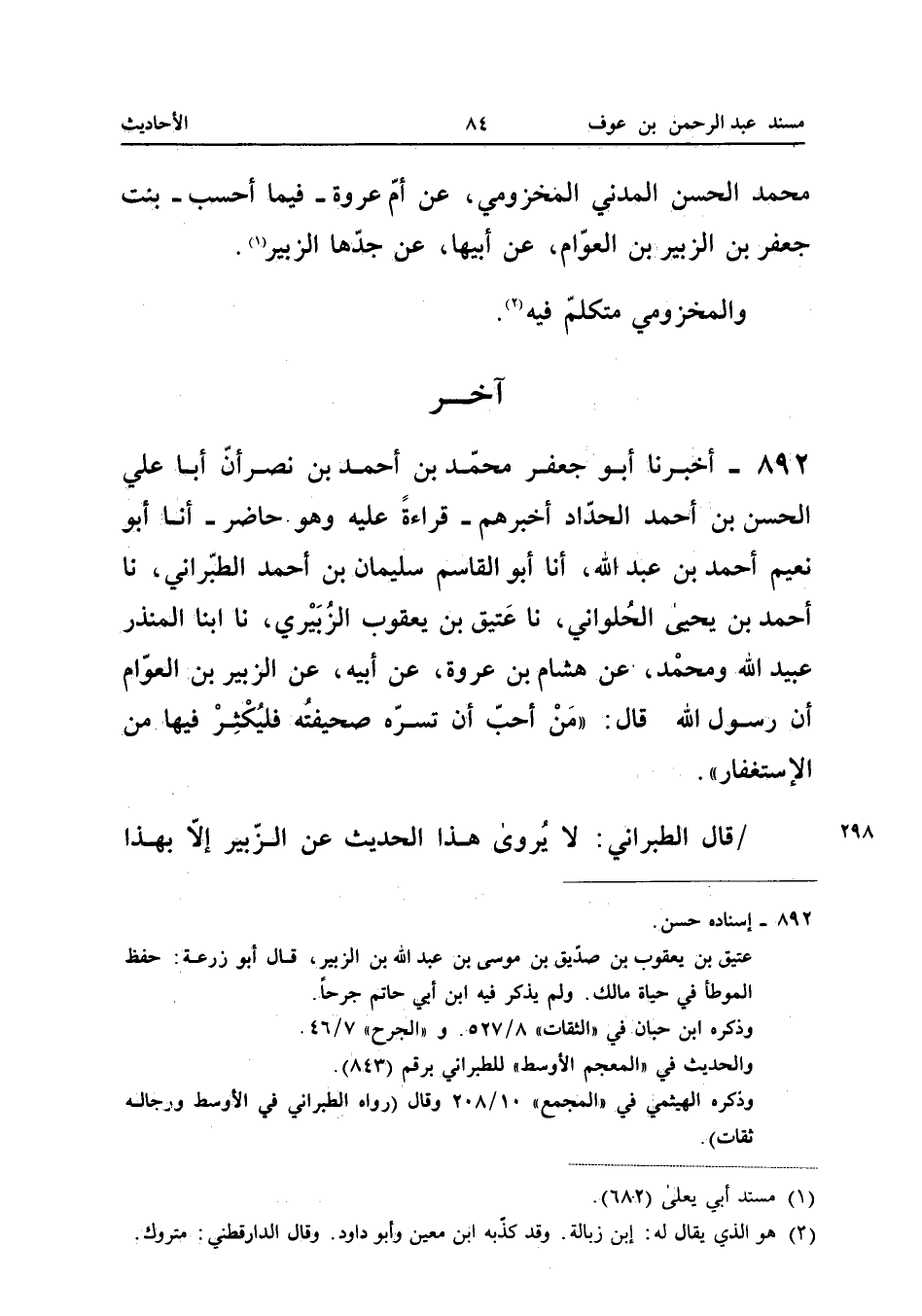 ٨٩٢ - أَخْبَرَنَا أَبُو جَعْفَرٍ مُحَمَّدُ بْنُ أَحْمَدَ بْنِ نَصْرٍ، أَنَّ أَبَا عَلِيٍّ الْحَسَنَ بْنَ أَحْمَدَ الْحَدَّادَ أَخْبَرَهُمْ قِرَاءَةً عَلَيْهِ وَهُوَ حَاضِرٌ، أَنَا أَبُو نُعَيْمٍ أَحْمَدُ بْنُ عَبْدِ اللهِ، أَنَا أَبُو الْقَاسِمِ سُلَيْمَانُ بْنُ أَحْمَدَ الطَّبَرَانِيُّ، نَا أَحْمَدُ بْنُ يَحْيَى الْحُلْوَانِيُّ، نَا عَتِيقُ بْنُ يَعْقُوبَ الزُّبَيْرِيُّ، نَا ابْنَا الْمُنْذِرِ عُبَيْدُ اللهِ وَمُحَمَّدٌ، عَنْ هِشَامِ بْنِ عُرْوَةَ، عَنْ أَبِيهِ، عَنِ الزُّبَيْرِ بْنِ الْعَوَّامِ، أَنَّ رَسُولَ اللهِ قَالَ: «مَنْ أَحَبَّ أَنْ تَسُرَّهُ صَحِيفَتُهُ فَلْيُكْثِرْ فِيهَا مِنَ الِاسْتِغْفَارِ».