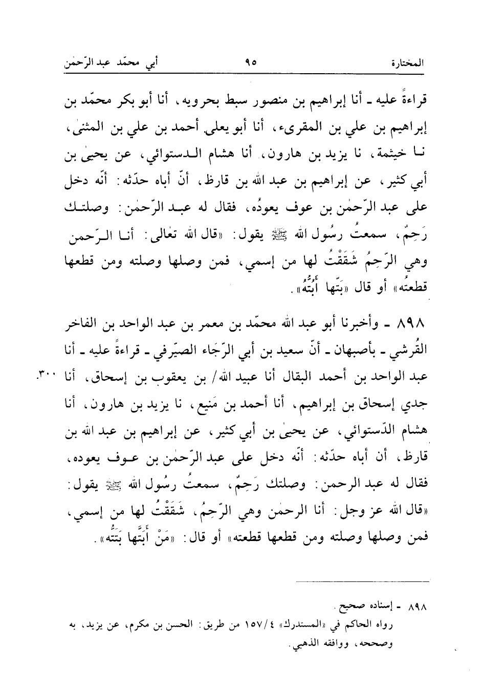 ٨٩٨ - وَأَخْبَرَنَا أَبُو عَبْدِ اللهِ مُحَمَّدُ بْنُ مَعْمَرِ بْنِ عَبْدِ الْوَاحِدِ بْنِ الْفَاخِرِ الْقُرَشِيُّ بِأَصْبَهَانَ، أَنَّ سَعِيدَ بْنَ أَبِي الرَّجَاءِ الصَّيْرَفِيَّ قِرَاءَةً عَلَيْهِ، أَنَا عَبْدُ الْوَاحِدِ بْنُ أَحْمَدَ الْبَقَّالُ، أَنَا عُبَيْدُ اللهِ بْنُ يَعْقُوبَ بْنِ إِسْحَاقَ، أَنَا جَدِّي إِسْحَاقُ بْنُ إِبْرَاهِيمَ، أَنَا أَحْمَدُ بْنُ مَنِيعٍ، نَا يَزِيدُ بْنُ هَارُونَ، أَنَا هِشَامٌ الدَّسْتُوَائِيُّ، عَنْ يَحْيَى بْنِ أَبِي كَثِيرٍ، عَنْ إِبْرَاهِيمَ بْنِ عَبْدِ اللهِ بْنِ قَارِظٍ، أَنَّ أَبَاهُ حَدَّثَهُ «أَنَّهُ دَخَلَ عَلَى عَبْدِ الرَّحْمَنِ بْنِ عَوْفٍ يَعُودُهُ، فَقَالَ لَهُ عَبْدُ الرَّحْمَنِ: وَصَلَتْكَ رَحِمٌ، سَمِعْتُ رَسُولَ اللهِ صَلَّى اللهُ عَلَيْهِ وَسَلَّمَ يَقُولُ: قَالَ اللهُ عَزَّ وَجَلَّ، أَنَا الرَّحْمَنُ، وَهِيَ الرَّحِمُ، شَقَقْتُ لَهَا مِنَ اسْمِي، فَمَنْ وَصَلَهَا وَصَلْتُهُ، وَمَنْ قَطَعَهَا قَطَعْتُهُ، أَوْ قَالَ: مَنْ أَبَتَّهَا بَتَتُّهُ».
