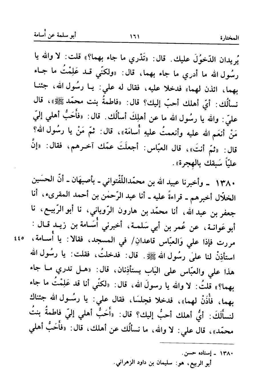 ١٣٨٠ - وَأَخْبَرَنَا عُبَيْدُ اللهِ بْنُ مُحَمَّدٍ اللَّفْتُوَانِيُّ - بِأَصْبَهَانَ - أَنَّ الْحُسَيْنَ الْخَلَّالَ أَخْبَرَهُمْ - قِرَاءَةً عَلَيْهِ - أَنَا عَبْدُ الرَّحْمَنِ بْنُ أَحْمَدَ الْمُقْرِئُ، أَنَا جَعْفَرُ بْنُ عَبْدِ اللهِ، أَنَا مُحَمَّدُ بْنُ هَارُونَ الرُّويَانِيُّ، نَا أَبُو الرَّبِيعِ، نَا أَبُو عَوَانَةَ، عَنْ عُمَرَ بْنِ أَبِي سَلَمَةَ، أَخْبَرَنِي أُسَامَةُ بْنُ زَيْدٍ قَالَ: «مَرَرْتُ فَإِذَا عَلِيٌّ وَالْعَبَّاسُ قَاعِدَانِ فِي الْمَسْجِدِ فَقَالَا: يَا أُسَامَةُ اسْتَأْذِنْ لَنَا عَلَى رَسُولِ اللهِ صَلَّى اللهُ عَلَيْهِ وَسَلَّمَ، قَالَ: فَدَخَلْتُ فَقُلْتُ: يَا رَسُولَ اللهِ هَذَا عَلِيٌّ وَالْعَبَّاسُ عَلَى الْبَابِ يَسْتَأْذِنَانِ، قَالَ: هَلْ تَدْرِي مَا جَاءَ بِهِمَا؟ قُلْتُ: لَا وَاللهِ يَا رَسُولَ اللهِ، قَالَ: لَكِنِّي أَنَا قَدْ عَلِمْتُ مَا جَاءَ بِهِمَا، فَأَذِنَ لَهُمَا، فَدَخَلَا فَجَلَسَا، فَقَالَ عَلِيٌّ: يَا رَسُولَ اللهِ جِئْنَاكَ لِنَسْأَلَكَ: أَيُّ أَهْلِكَ أَحَبُّ إِلَيْكَ؟ قَالَ: أَحَبُّ أَهْلِي إِلَيَّ فَاطِمَةُ بِنْتُ مُحَمَّدٍ، قَالَ عَلِيٌّ: لَا وَاللهِ، مَا نَسْأَلُكَ عَنْ أَهْلِكَ، قَالَ: فَأَحَبُّ أَهْلِي