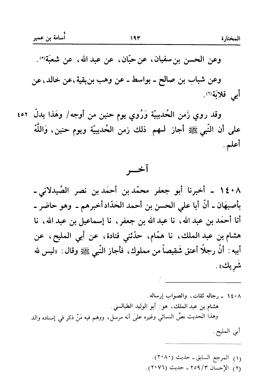 ١٤٠٨ - أَخْبَرَنَا أَبُو جَعْفَرٍ مُحَمَّدُ بْنُ أَحْمَدَ بْنِ نَصْرٍ الصَّيْدَلَانِيُّ - بِأَصْبَهَانَ - أَنَّ أَبَا عَلِيٍّ الْحَسَنَ بْنَ أَحْمَدَ الْحَدَّادَ أَخْبَرَهُمْ - وَهُوَ حَاضِرٌ - أَنَا أَحْمَدُ بْنُ عَبْدِ اللهِ، نَا عَبْدُ اللهِ بْنُ جَعْفَرٍ، نَا إِسْمَاعِيلُ بْنُ عَبْدِ اللهِ، نَا هِشَامُ بْنُ عَبْدِ الْمَلِكِ، نَا هَمَّامٌ، حَدَّثَنِي قَتَادَةُ، عَنْ أَبِي الْمَلِيحِ، عَنْ أَبِيهِ: «أَنَّ رَجُلًا أَعْتَقَ شَقِيصًا مِنْ مَمْلُوكٍ، فَأَجَازَ النَّبِيُّ صَلَّى اللهُ عَلَيْهِ وَسَلَّمَ وَقَالَ: لَيْسَ لِلهِ شَرِيكٌ».