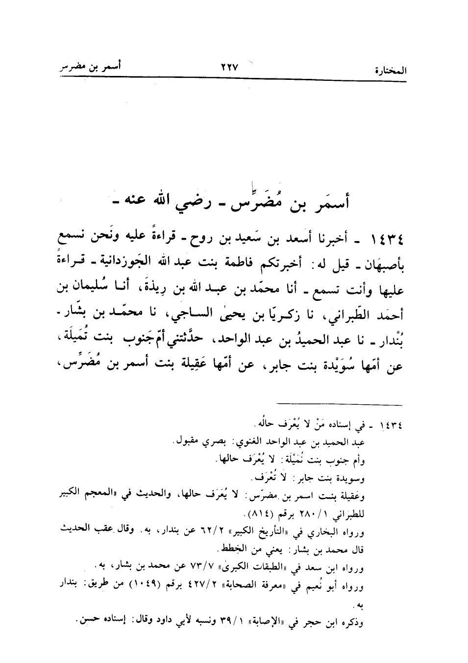 ١٤٣٤ - أَخْبَرَنَا أَسْعَدُ بْنُ سَعِيدِ بْنِ رَوْحٍ - قِرَاءَةً عَلَيْهِ وَنَحْنُ نَسْمَعُ بِأَصْبَهَانَ - قِيلَ لَهُ: أَخْبَرَتْكُمْ فَاطِمَةُ بِنْتُ عَبْدِ اللهِ الْجُوزْدَانِيَّةُ - قِرَاءَةً عَلَيْهَا وَأَنْتَ تَسْمَعُ - أَنَا مُحَمَّدُ بْنُ عَبْدِ اللهِ بْنِ رِيذَةَ، أَنَا سُلَيْمَانُ بْنُ أَحْمَدَ الطَّبَرَانِيُّ، نَا زَكَرِيَّا بْنُ يَحْيَى السَّاجِيُّ، نَا مُحَمَّدُ بْنُ بَشَّارٍ - بُنْدَارٌ - نَا عَبْدُ الْحَمِيدِ بْنُ عَبْدِ الْوَاحِدِ، حَدَّثَتْنِي أُمُّ جَنُوبٍ بِنْتُ تُمَيْلَةَ، عَنْ أُمِّهَا سُوَيْدَةَ بِنْتِ جَابِرٍ، عَنْ أُمِّهَا عَقِيلَةَ بِنْتِ أَسْمَرَ بْنِ مُضَرِّسٍ،