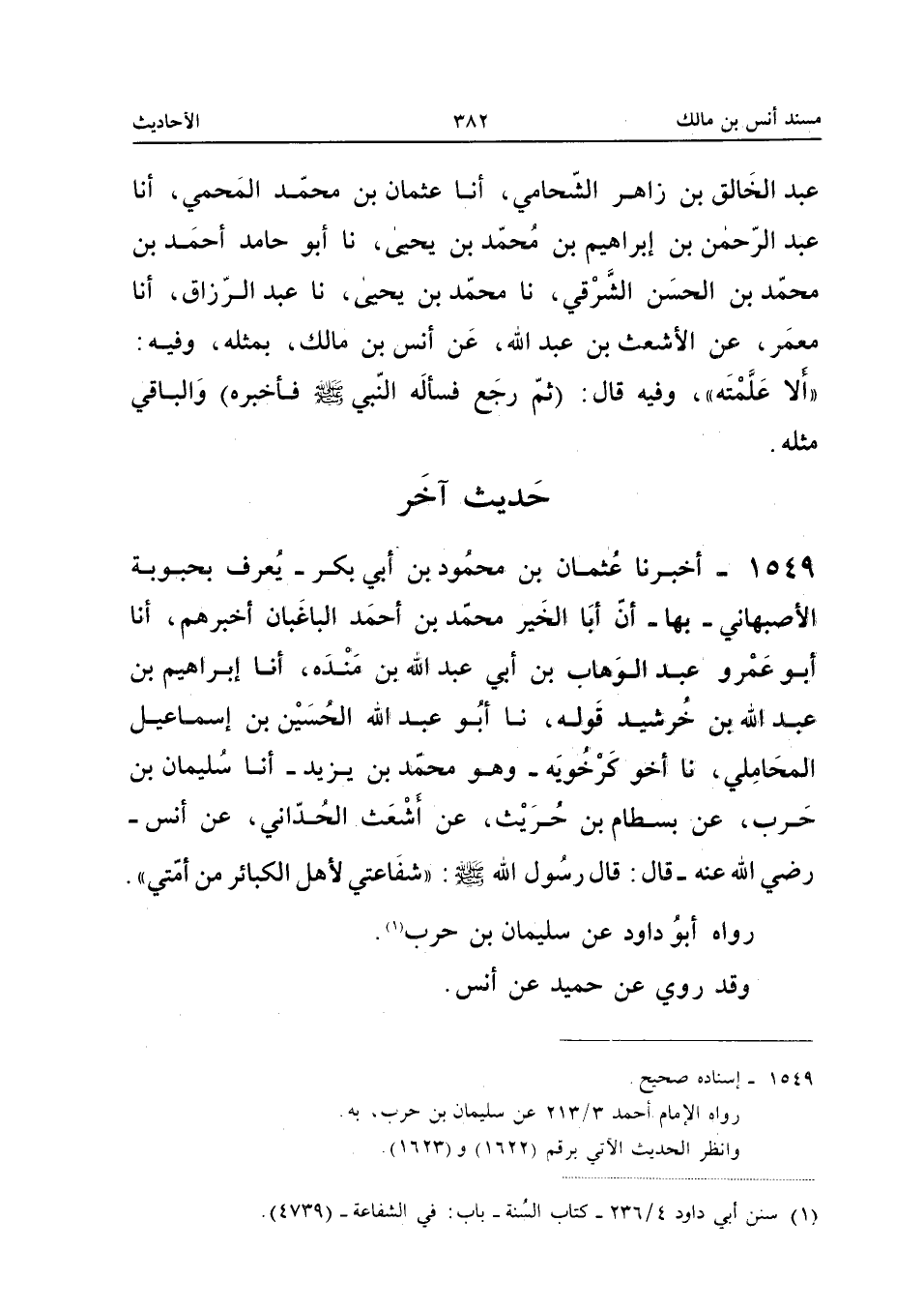 ١٥٤٩ - أَخْبَرَنَا عُثْمَانُ بْنُ مَحْمُودِ بْنِ أَبِي بَكْرٍ - يُعْرَفُ بِحَبُّوبَةَ الْأَصْبَهَانِيِّ - بِهَا - أَنَّ أَبَا الْخَيْرِ مُحَمَّدَ بْنَ أَحْمَدَ الْبَاغْبَانَ أَخْبَرَهُمْ، أَنَا أَبُو عَمْرٍو عَبْدُ الْوَهَّابِ بْنُ أَبِي عَبْدِ اللهِ بْنِ مَنْدَهْ، أَنَا إِبْرَاهِيمُ بْنُ عَبْدِ اللهِ بْنِ خُرْشَيْدَ قَوْلَهُ، نَا أَبُو عَبْدِ اللهِ الْحُسَيْنُ بْنُ إِسْمَاعِيلَ الْمَحَامِلِيُّ، نَا أَخُو كَرْخَوَيْهِ - وَهُوَ مُحَمَّدُ بْنُ يَزِيدَ - أَنَا سُلَيْمَانُ بْنُ حَرْبٍ، عَنْ بِسْطَامِ بْنِ حُرَيْثٍ، عَنْ أَشْعَثَ الْحُدَّانِيِّ، عَنْ أَنَسٍ - رَضِيَ اللهُ عَنْهُ - قَالَ: قَالَ رَسُولُ اللهِ صَلَّى اللهُ عَلَيْهِ وَسَلَّمَ: «شَفَاعَتِي لِأَهْلِ الْكَبَائِرِ مِنْ أُمَّتِي».