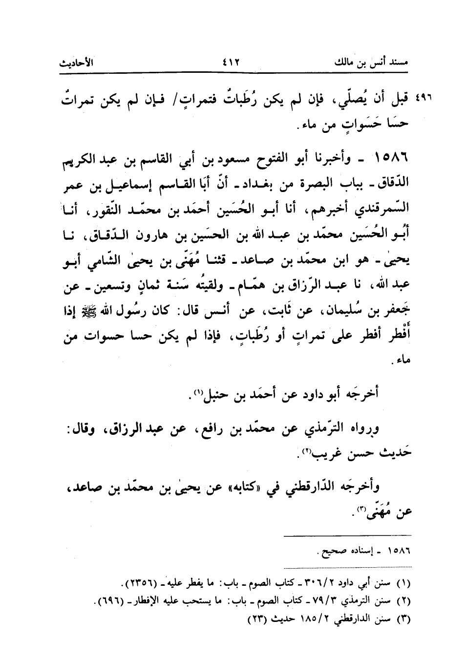 ١٥٨٦ - وَأَخْبَرَنَا أَبُو الْفُتُوحِ مَسْعُودُ بْنُ أَبِي الْقَاسِمِ بْنِ عَبْدِ الْكَرِيمِ الدَّقَّاقُ - بِبَابِ الْبَصْرَةِ مِنْ بَغْدَادَ - أَنَّ أَبَا الْقَاسِمِ إِسْمَاعِيلَ بْنَ عُمَرَ السَّمَرْقَنْدِيَّ أَخْبَرَهُمْ، أَنَا أَبُو الْحُسَيْنِ أَحْمَدُ بْنُ مُحَمَّدٍ النَّقُّورُ، أَنَا أَبُو الْحُسَيْنِ مُحَمَّدُ بْنُ عَبْدِ اللهِ بْنِ الْحُسَيْنِ بْنِ هَارُونَ الدَّقَّاقُ، نَا يَحْيَى - هُوَ ابْنُ مُحَمَّدِ بْنُ صَاعِدٍ - قَثَنَا مُهَنَّى بْنُ يَحْيَى الشَّامِيُّ أَبُو عَبْدِ اللهِ، نَا عَبْدُ الرَّزَّاقِ بْنُ هَمَّامٍ - وَلَقِيتُهُ سَنَةَ ثَمَانٍ وَتِسْعِينَ - عَنْ جَعْفَرِ بْنِ سُلَيْمَانَ، عَنْ ثَابِتٍ، عَنْ أَنَسٍ قَالَ: «كَانَ رَسُولُ اللهِ صَلَّى اللهُ عَلَيْهِ وَسَلَّمَ إِذَا أَفْطَرَ أَفْطَرَ عَلَى تَمَرَاتٍ أَوْ رُطَبَاتٍ، فَإِذَا لَمْ يَكُنْ حَسَا حَسَوَاتٍ مِنْ مَاءٍ».