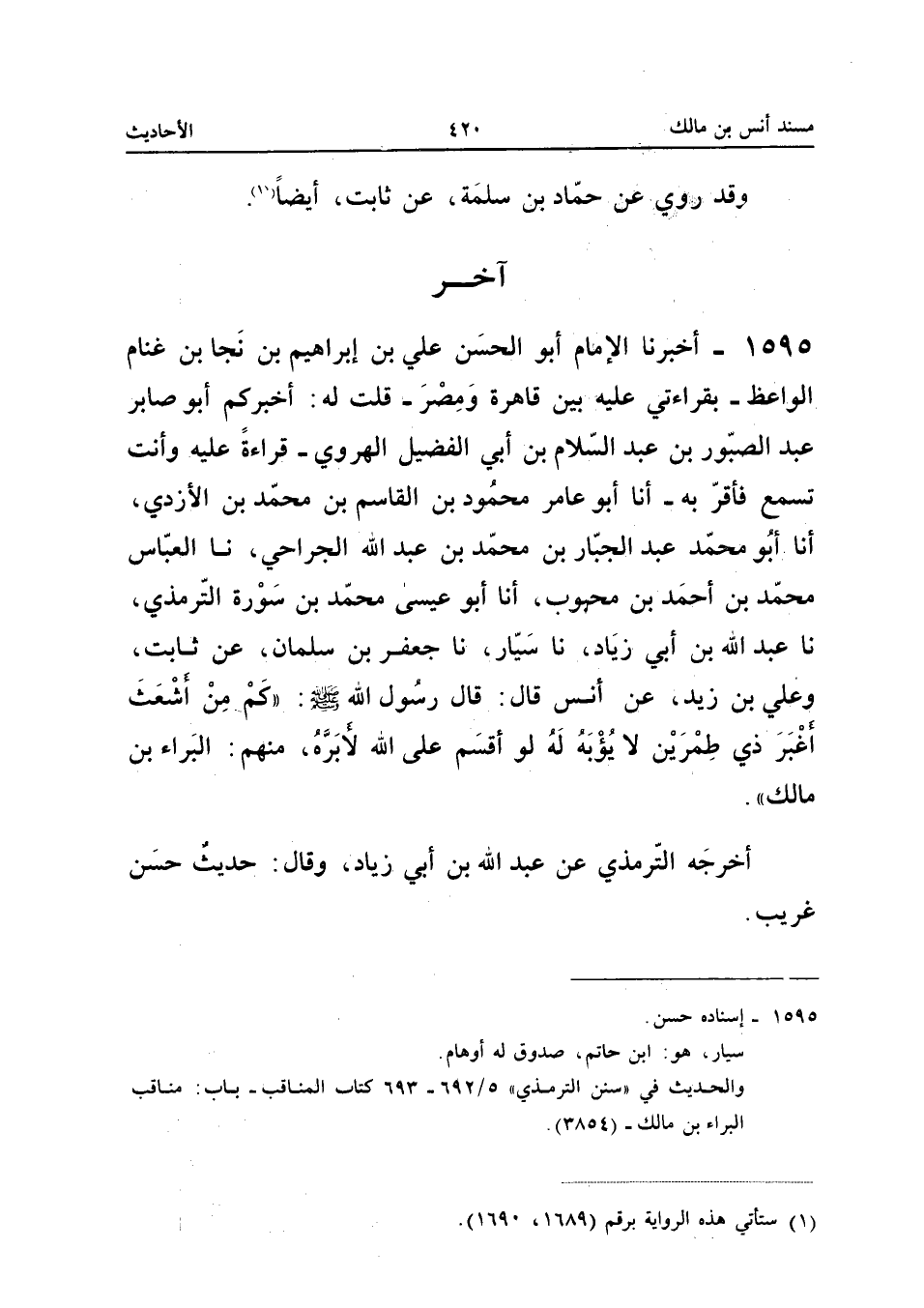 ١٥٩٥ - أَخْبَرَنَا الْإِمَامُ أَبُو الْحَسَنِ عَلِيُّ بْنُ إِبْرَاهِيمَ بْنِ نَجَا بْنِ غَنَّامٍ الْوَاعِظُ - بِقِرَاءَتِي عَلَيْهِ بَيْنَ قَاهِرَةَ وَمِصْرَ - قُلْتُ لَهُ: أَخْبَرَكُمْ أَبُو صَابِرٍ عَبْدُ الصَّبُورِ بْنُ عَبْدِ السَّلَامِ بْنِ أَبِي الْفُضَيْلِ الْهَرَوِيُّ - قِرَاءَةً عَلَيْهِ وَأَنْتَ تَسْمَعُ فَأَقَرَّ بِهِ - أَنَا أَبُو عَامِرٍ مَحْمُودُ بْنُ الْقَاسِمِ بْنِ مُحَمَّدِ بْنِ الْأَزْدِيِّ، أَنَا أَبُو مُحَمَّدٍ عَبْدُ الْجَبَّارِ بْنُ مُحَمَّدِ بْنِ عَبْدِ اللهِ الْجَرَّاحِيُّ، نَا الْعَبَّاسُ مُحَمَّدُ بْنُ أَحْمَدَ بْنِ مَحْبُوبٍ، أَنَا أَبُو عِيسَى مُحَمَّدُ بْنُ سَوْرَةَ التِّرْمِذِيُّ، نَا عَبْدُ اللهِ بْنُ أَبِي زِيَادٍ، نَا سَيَّارٌ، نَا جَعْفَرُ بْنُ سَلْمَانَ (¬١)، عَنْ ثَابِتٍ، وَعَلِيِّ بْنِ زَيْدٍ، عَنْ أَنَسٍ قَالَ: قَالَ رَسُولُ اللهِ صَلَّى اللهُ عَلَيْهِ وَسَلَّمَ: «كَمْ مِنْ أَشْعَثَ أَغْبَرَ ذِي طِمْرَيْنِ لَا يُؤْبَهُ لَهُ لَوْ أَقْسَمَ عَلَى اللهِ لَأَبَرَّهُ، مِنْهُمُ الْبَرَاءُ بْنُ مَالِكٍ».