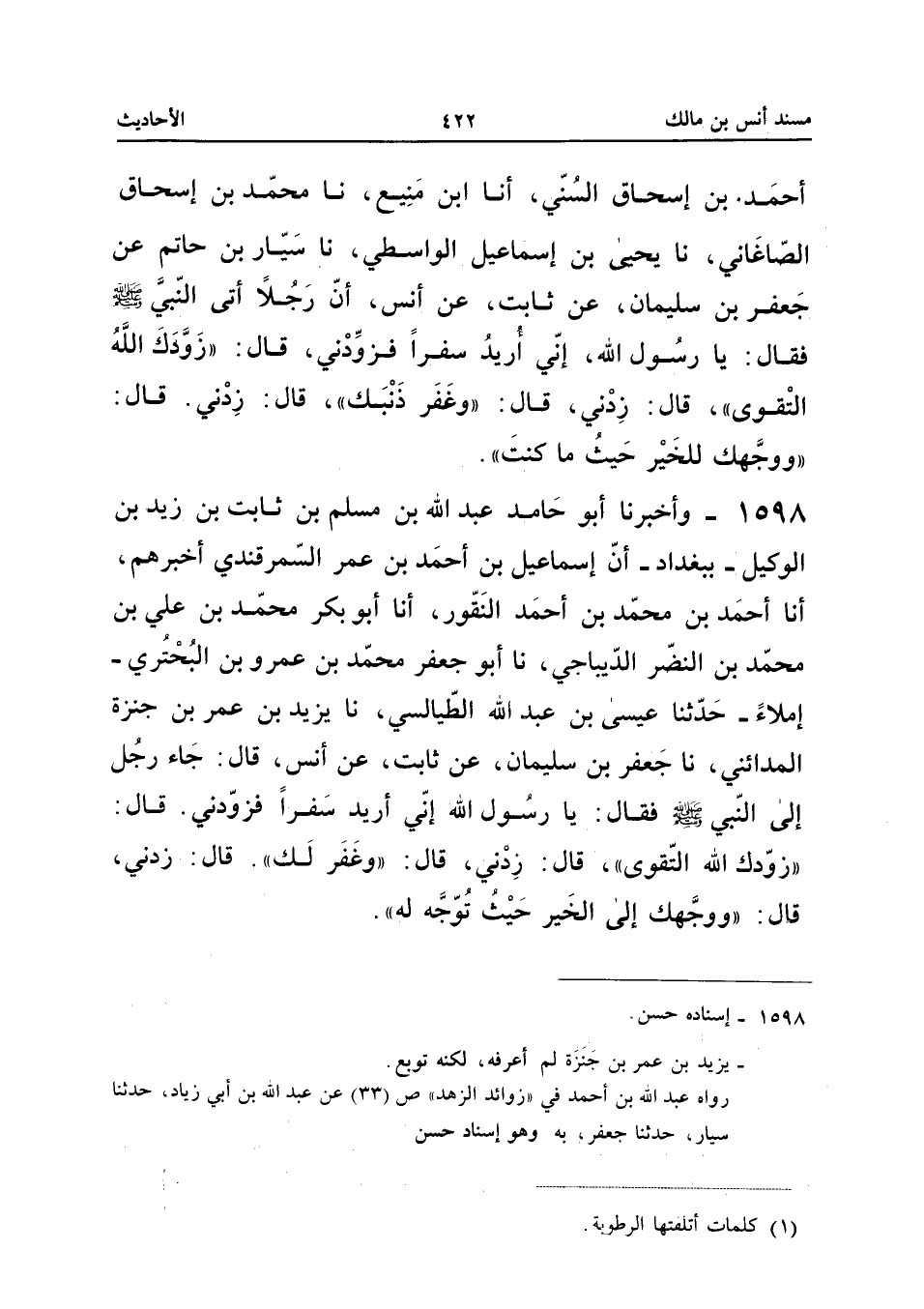 ١٥٩٨ - وَأَخْبَرَنَا أَبُو حَامِدٍ عَبْدُ اللهِ بْنُ مُسْلِمِ بْنِ ثَابِتِ بْنِ زَيْدِ بْنِ الْوَكِيلِ - بِبَغْدَادَ - أَنَّ إِسْمَاعِيلَ بْنَ أَحْمَدَ بْنِ عُمَرَ السَّمَرْقَنْدِيَّ أَخْبَرَهُمْ، أَنَا أَحْمَدُ بْنُ مُحَمَّدِ بْنِ أَحْمَدَ النَّقُّورُ، أَنَا أَبُو بَكْرٍ مُحَمَّدُ بْنُ عَلِيِّ بْنِ مُحَمَّدِ بْنِ النَّضْرِ الدِّيبَاجِيُّ، نَا أَبُو جَعْفَرٍ مُحَمَّدُ بْنُ عَمْرِو بْنِ الْبُحْتُرِيِّ - إِمْلَاءً - حَدَّثَنَا عِيسَى بْنُ عَبْدِ اللهِ الطَّيَالِسِيُّ، نَا يَزِيدُ بْنُ عُمَرَ بْنِ جَنْزَةَ الْمَدَائِنِيُّ، نَا جَعْفَرُ بْنُ سُلَيْمَانَ، عَنْ ثَابِتٍ، عَنْ أَنَسٍ قَالَ: «جَاءَ رَجُلٌ إِلَى النَّبِيِّ صَلَّى اللهُ عَلَيْهِ وَسَلَّمَ فَقَالَ: يَا رَسُولَ اللهِ إِنِّي أُرِيدُ سَفَرًا فَزَوِّدْنِي، قَالَ: زَوَّدَكَ اللهُ التَّقْوَى، قَالَ: زِدْنِي، قَالَ: وَغَفَرَ لَكَ، قَالَ: زِدْنِي، قَالَ: وَوَجَّهَكَ إِلَى الْخَيْرِ حَيْثُ تُوَجَّهُ لَهُ».