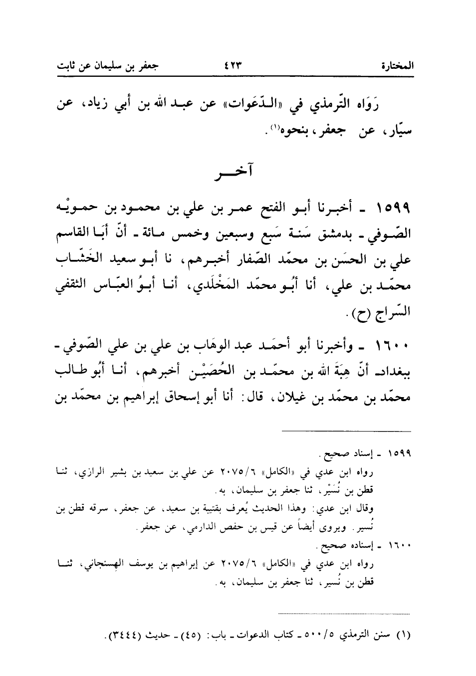 ١٥٩٩ - أَخْبَرَنَا أَبُو الْفَتْحِ عُمَرُ بْنُ عَلِيِّ بْنِ مَحْمُودِ بْنِ حَمُّويَهْ الصُّوفِيُّ - بِدِمَشْقَ سَنَةَ سَبْعٍ وَسَبْعِينَ وَخَمْسِ مِائَةٍ - أَنَّ أَبَا الْقَاسِمِ عَلِيَّ بْنَ الْحَسَنِ بْنِ مُحَمَّدٍ الصَّفَّارَ أَخْبَرَهُمْ، نَا أَبُو سَعِيدٍ الْخَشَّابُ مُحَمَّدُ بْنُ عَلِيٍّ، أَنَا أَبُو مُحَمَّدٍ الْمَخْلَدِيُّ، أَنَا أَبُو الْعَبَّاسِ الثَّقَفِيُّ السَّرَّاجُ (ح).