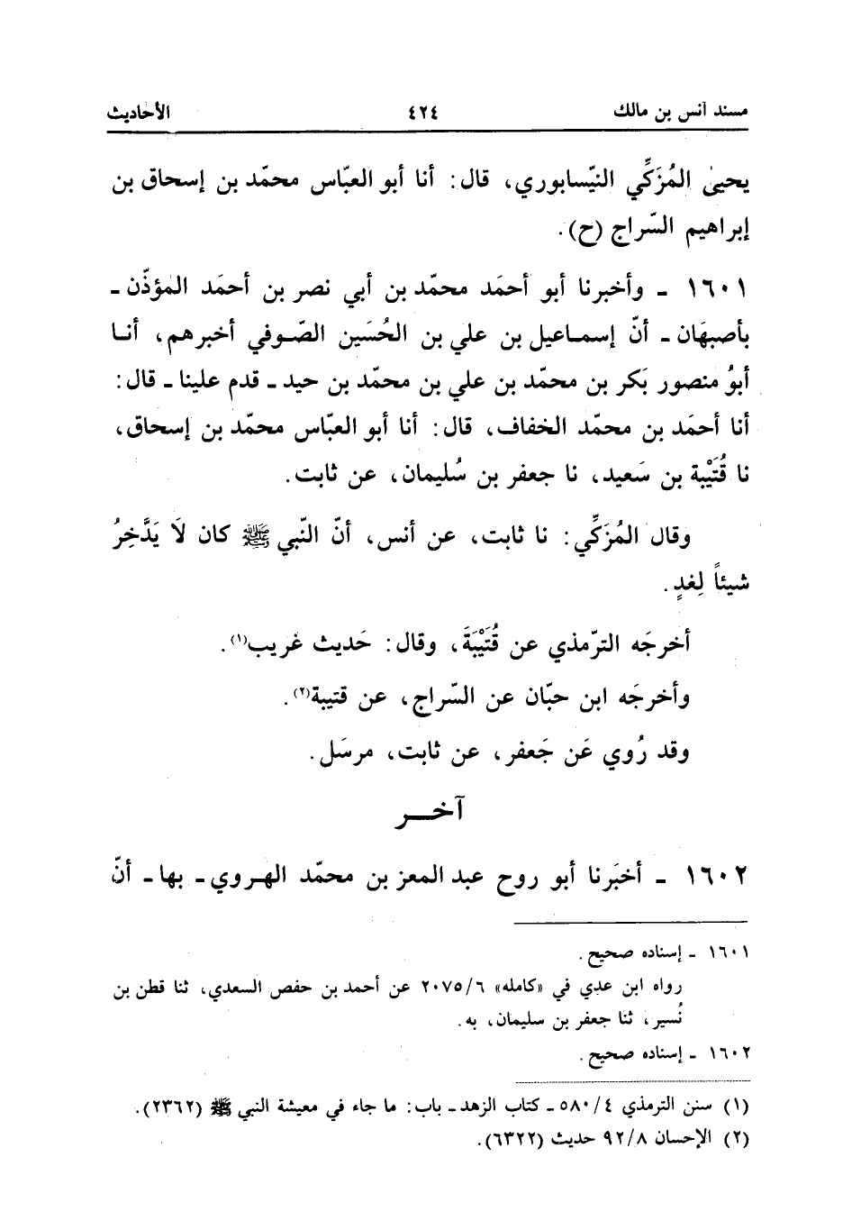 ١٦٠١ - وَأَخْبَرَنَا أَبُو أَحْمَدَ مُحَمَّدُ بْنُ أَبِي نَصْرِ بْنِ أَحْمَدَ الْمُؤَذِّنُ - بِأَصْبَهَانَ - أَنَّ إِسْمَاعِيلَ بْنَ عَلِيِّ بْنِ الْحُسَيْنِ الصُّوفِيَّ أَخْبَرَهُمْ، أَنَا أَبُو مَنْصُورٍ بَكْرُ بْنُ مُحَمَّدِ بْنِ عَلِيِّ بْنِ مُحَمَّدِ بْنِ حِيدٍ - قَدِمَ عَلَيْنَا - قَالَ: أَنَا أَحْمَدُ بْنُ مُحَمَّدٍ الْخَفَّافُ قَالَ: أَنَا أَبُو الْعَبَّاسِ مُحَمَّدُ بْنُ إِسْحَاقَ، نَا قُتَيْبَةُ بْنُ سَعِيدٍ، نَا جَعْفَرُ بْنُ سُلَيْمَانَ، عَنْ ثَابِتٍ.