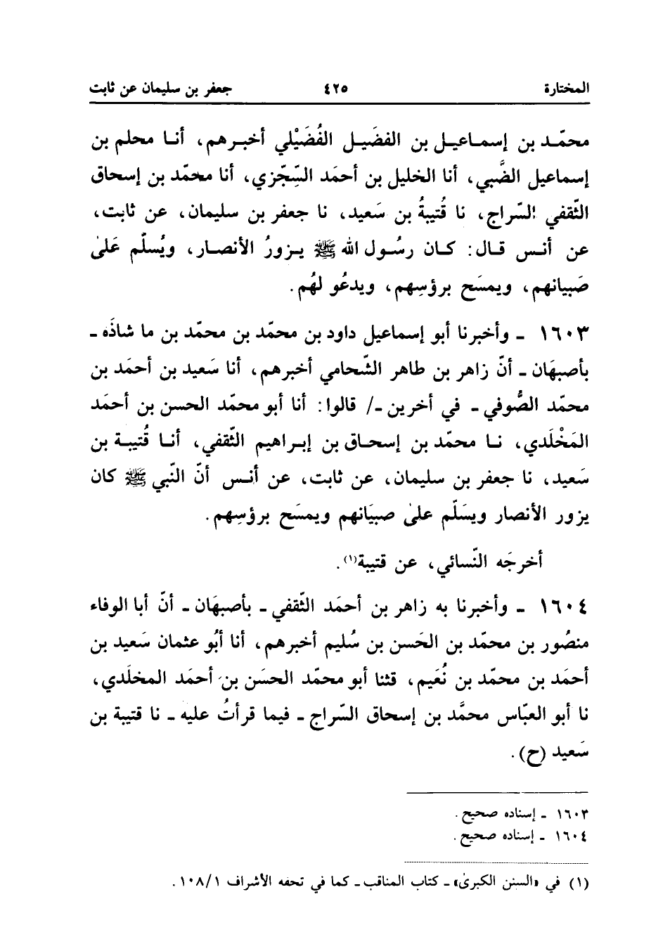 ١٦٠٣ - وَأَخْبَرَنَا أَبُو إِسْمَاعِيلَ دَاوُدُ بْنُ مُحَمَّدِ بْنِ مُحَمَّدِ بْنِ مَاشَاذَهْ - بِأَصْبَهَانَ - أَنَّ زَاهِرَ بْنَ طَاهِرٍ الشَّحَّامِيَّ أَخْبَرَهُمْ، أَنَا سَعِيدُ بْنُ أَحْمَدَ بْنِ مُحَمَّدٍ الصُّوفِيُّ - فِي آخَرِينَ - قَالُوا: أَنَا أَبُو مُحَمَّدٍ الْحَسَنُ بْنُ أَحْمَدَ الْمَخْلَدِيُّ، نَا مُحَمَّدُ بْنُ إِسْحَاقَ بْنِ إِبْرَاهِيمَ الثَّقَفِيُّ، أَنَا قُتَيْبَةُ بْنُ سَعِيدٍ، نَا جَعْفَرُ بْنُ سُلَيْمَانَ، عَنْ ثَابِتٍ، عَنْ أَنَسٍ أَنَّ النَّبِيَّ صَلَّى اللهُ عَلَيْهِ وَسَلَّمَ «كَانَ يَزُورُ الْأَنْصَارَ وَيُسَلِّمُ عَلَى صِبْيَانِهِمْ وَيَمْسَحُ بِرُؤُوسِهِمْ».