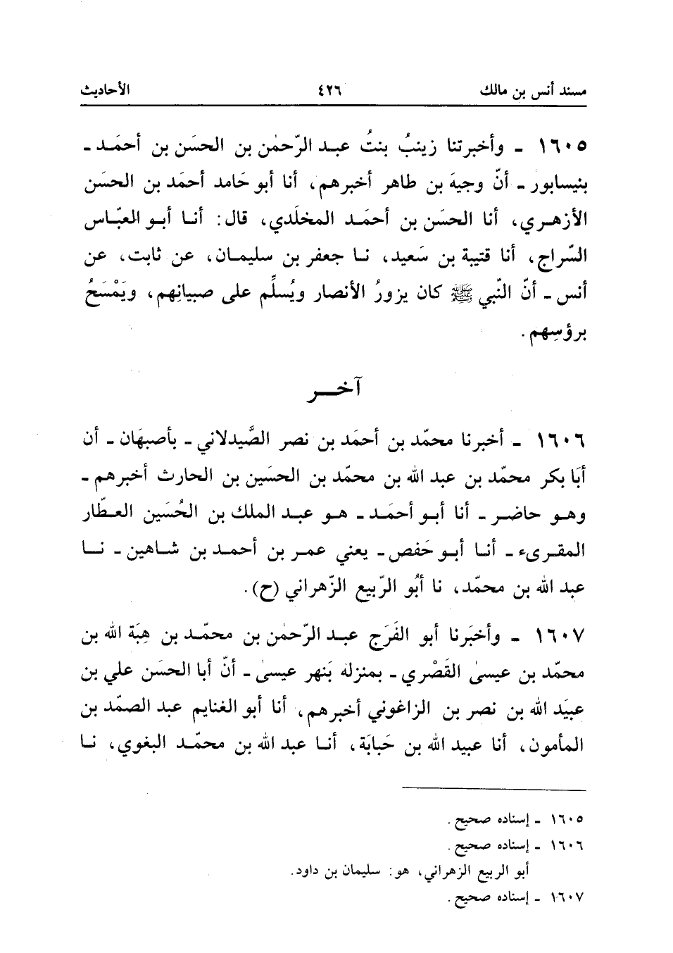 ١٦٠٥ - وَأَخْبَرَتْنَا زَيْنَبُ بِنْتُ عَبْدِ الرَّحْمَنِ بْنِ الْحَسَنِ بْنِ أَحْمَدَ - بِنَيْسَابُورَ - أَنَّ وَجِيهَ بْنَ طَاهِرٍ أَخْبَرَهُمْ، أَنَا أَبُو حَامِدٍ أَحْمَدُ بْنُ الْحَسَنِ الْأَزْهَرِيُّ، أَنَا الْحَسَنُ بْنُ أَحْمَدَ الْمَخْلَدِيُّ قَالَ: أَنَا أَبُو الْعَبَّاسِ السَّرَّاجُ، أَنَا قُتَيْبَةُ بْنُ سَعِيدٍ، نَا جَعْفَرُ بْنُ سُلَيْمَانَ، عَنْ ثَابِتٍ، عَنْ أَنَسٍ، أَنَّ النَّبِيَّ صَلَّى اللهُ عَلَيْهِ وَسَلَّمَ «كَانَ يَزُورُ الْأَنْصَارَ وَيُسَلِّمُ عَلَى صِبْيَانِهِمْ، وَيَمْسَحُ بِرُؤُوسِهِمْ».