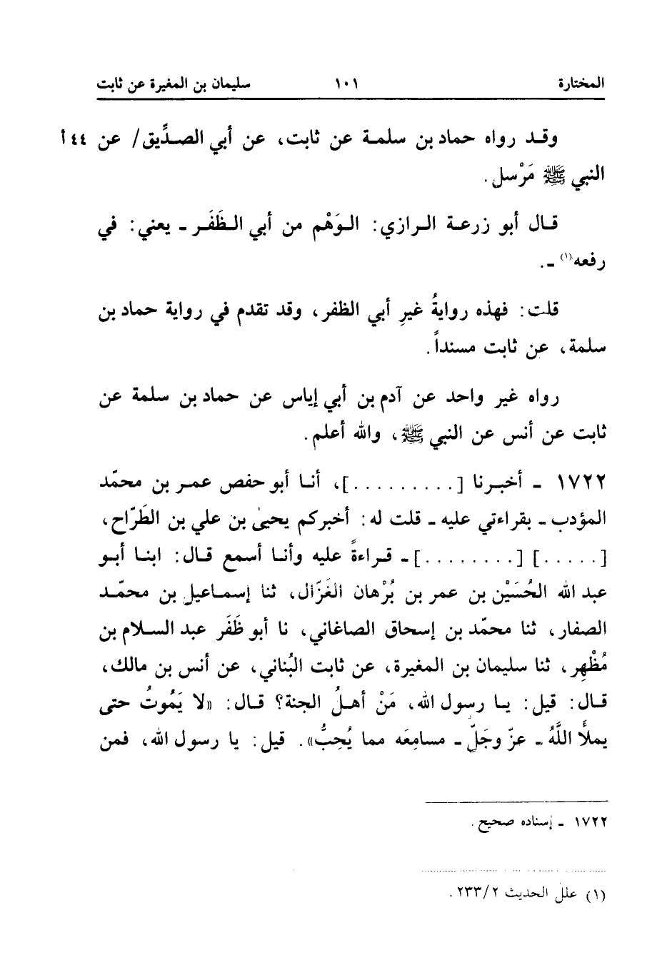 ١٧٢٢ - أَخْبَرَنَا [ ........ ]، أَنَا أَبُو حَفْصٍ عُمَرُ بْنُ مُحَمَّدٍ الْمُؤَدِّبُ - بِقِرَاءَتِي عَلَيْهِ - قُلْتُ لَهُ: أَخْبَرَكُمْ يَحْيَى بْنُ عَلِيِّ بْنِ الطَّرَّاحِ [ ..... ] [ ........ ] قِرَاءَةً عَلَيْهِ وَأَنَا أَسْمَعُ، قَالَ: أَبْنَا أَبُو عَبْدِ اللهِ الْحُسَيْنُ بْنُ عُمَرَ بْنِ بُرْهَانَ الْغَزَّالُ، ثَنَا إِسْمَاعِيلُ بْنُ مُحَمَّدٍ الصَّفَّارُ، ثَنَا مُحَمَّدُ بْنُ إِسْحَاقَ الصَّاغَانِيُّ، نَا أَبُو ظَفَرٍ عَبْدُ السَّلَامِ بْنُ مُظْهِرٍ، ثَنَا سُلَيْمَانُ بْنُ الْمُغِيرَةِ، عَنْ ثَابِتٍ الْبُنَانِيِّ، عَنْ أَنَسِ بْنِ مَالِكٍ، قَالَ: «قِيلَ يَا رَسُولَ اللهِ، مَنْ أَهْلُ الْجَنَّةِ؟ قَالَ: لَا يَمُوتُ حَتَّى يَمْلَأَ اللهُ عَزَّ وَجَلَّ مَسَامِعَهُ مِمَّا يُحِبُّ. قِيلَ: يَا رَسُولَ اللهِ، فَمَنْ