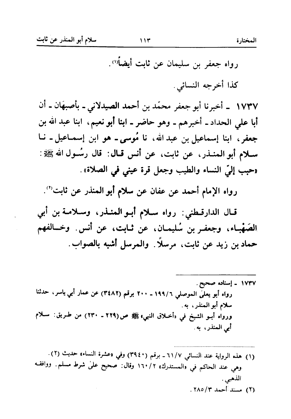 ١٧٣٧ - أَخْبَرَنَا أَبُو جَعْفَرٍ مُحَمَّدُ بْنُ أَحْمَدَ الصَّيْدَلَانِيُّ - بِأَصْبَهَانَ - أَنَّ أَبَا عَلِيٍّ الْحَدَّادَ أَخْبَرَهُمْ وَهُوَ حَاضِرٌ، أَبْنَا أَبُو نُعَيْمٍ، أَبْنَا عَبْدُ اللهِ بْنُ جَعْفَرٍ، أَبْنَا إِسْمَاعِيلُ بْنُ عَبْدِ اللهِ، نَا مُوسَى هُوَ ابْنُ إِسْمَاعِيلَ، نَا سَلَّامٌ أَبُو الْمُنْذِرِ، عَنْ ثَابِتٍ، عَنْ أَنَسٍ، قَالَ: قَالَ رَسُولُ اللهِ - صَلَّى اللهُ عَلَيْهِ وَسَلَّمَ -: «حُبِّبَ إِلَيَّ النِّسَاءُ وَالطِّيبُ، وَجُعِلَ قُرَّةُ عَيْنِي فِي الصَّلَاةِ».