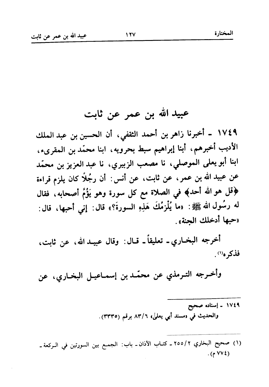 ١٧٤٩ - أَخْبَرَنَا زَاهِرُ بْنُ أَحْمَدَ الثَّقَفِيُّ أَنَّ الْحُسَيْنَ بْنَ عَبْدِ الْمَلِكِ الْأَدِيبَ أَخْبَرَهُمْ، أَبْنَا إِبْرَاهِيمُ سِبْطُ بَحْرَوَيْهِ، أَبْنَا مُحَمَّدُ بْنُ الْمُقْرِئِ، أَبْنَا أَبُو يَعْلَى الْمَوْصِلِيُّ، نَا مُصْعَبٌ الزُّبَيْرِيُّ، نَا عَبْدُ الْعَزِيزِ بْنُ مُحَمَّدٍ، عَنْ عُبَيْدِ اللهِ بْنِ عُمَرَ، عَنْ ثَابِتٍ، عَنْ أَنَسٍ «أَنَّ رَجُلًا كَانَ يَلْزَمُ قِرَاءَةَ: {قُلْ هُوَ اللهُ أَحَدٌ} فِي الصَّلَاةِ مَعَ كُلِّ سُورَةٍ وَهُوَ يَؤُمُّ أَصْحَابَهُ فَقَالَ لَهُ رَسُولُ اللهِ - صَلَّى اللهُ عَلَيْهِ وَسَلَّمَ -: مَا يُلْزِمُكَ هَذِهِ السُّورَةَ؟ قَالَ: إِنِّي أُحِبُّهَا، قَالَ: حُبُّهَا أَدْخَلَكَ الْجَنَّةَ».