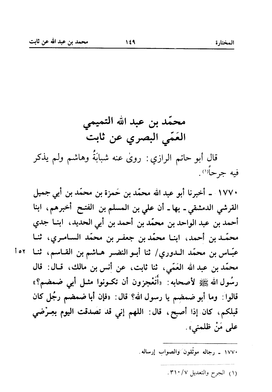 ١٧٧٠ - أَخْبَرَنَا أَبُو عَبْدِ اللهِ مُحَمَّدُ بْنُ حَمْزَةَ بْنِ مُحَمَّدِ بْنِ أَبِي جَمِيلٍ الْقُرَشِيُّ الدِّمَشْقِيُّ - بِهَا - أَنَّ عَلِيَّ بْنَ الْمُسْلِمِ بْنِ الْفَتْحِ أَخْبَرَهُمْ، أَبْنَا أَحْمَدُ بْنُ عَبْدِ الْوَاحِدِ بْنِ مُحَمَّدِ بْنِ أَحْمَدَ بْنِ أَبِي الْحَدِيدِ، أَبْنَا جَدِّي مُحَمَّدُ بْنُ أَحْمَدَ، أَبْنَا مُحَمَّدُ بْنُ جَعْفَرِ بْنِ مُحَمَّدٍ السَّامِرِيُّ، ثَنَا عَبَّاسُ بْنُ مُحَمَّدٍ الدُّورِيُّ، ثَنَا أَبُو النَّضْرِ هَاشِمُ بْنُ الْقَاسِمِ، ثَنَا مُحَمَّدُ بْنُ عَبْدِ اللهِ الْعَمِّيُّ، ثَنَا ثَابِتٌ، عَنْ أَنَسِ بْنِ مَالِكٍ، قَالَ: قَالَ رَسُولُ اللهِ - صَلَّى اللهُ عَلَيْهِ وَسَلَّمَ - لِأَصْحَابِهِ: «أَتَعْجَزُونَ أَنْ تَكُونُوا مِثْلَ أَبِي ضَمْضَمٍ؟ قَالُوا: وَمَا أَبُو ضَمْضَمٍ يَا رَسُولَ اللهِ؟ قَالَ: فَإِنَّ أَبَا ضَمْضَمٍ رَجُلٌ كَانَ قَبْلَكُمْ، كَانَ إِذَا أَصْبَحَ، قَالَ: اللَّهُمَّ إِنِّي قَدْ تَصَدَّقْتُ الْيَوْمَ بِعِرْضِي عَلَى مَنْ ظَلَمَنِي».