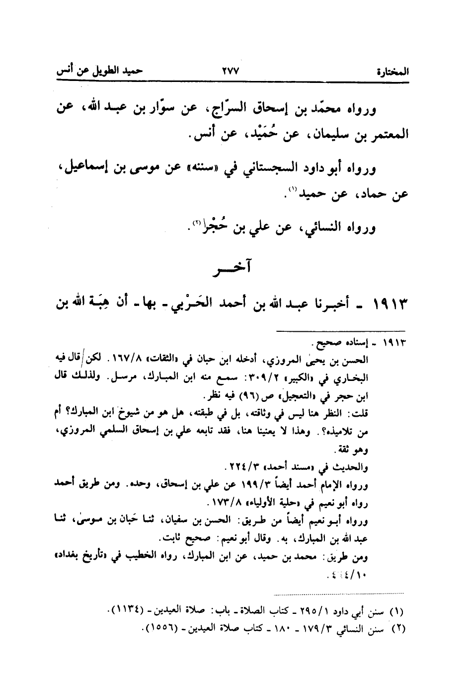 مُحَمَّدٍ أَخْبَرَهُمْ، أَبْنَا الْحَسَنُ بْنُ عَلِيٍّ، أَبْنَا أَحْمَدُ بْنُ جَعْفَرٍ، ثَنَا عَبْدُ اللهِ بْنُ أَحْمَدَ، حَدَّثَنِي أَبِي، ثَنَا عَلِيُّ بْنُ إِسْحَاقَ، وَالْحَسَنُ بْنُ يَحْيَى قَالَا: أَبْنَا عَبْدُ اللهِ - هُوَ ابْنُ الْمُبَارَكِ - أَبْنَا حُمَيْدٌ الطَّوِيلُ، عَنْ أَنَسٍ أَنَّ رَسُولَ اللهِ - صَلَّى اللهُ عَلَيْهِ وَسَلَّمَ - قَالَ: «أُمِرْتُ أَنْ أُقَاتِلَ النَّاسَ حَتَّى يَشْهَدُوا أَنْ لَا إِلَهَ إِلَّا اللهُ وَأَنَّ مُحَمَّدًا رَسُولُ اللهِ، فَإِذَا شَهِدُوا أَنْ لَا إِلَهَ إِلَّا اللهُ وَأَنَّ مُحَمَّدًا رَسُولُ اللهِ - صَلَّى اللهُ عَلَيْهِ وَسَلَّمَ - وَاسْتَقْبَلُوا قِبْلَتَنَا، وَأَكَلُوا ذَبِيحَتَنَا، وَصَلَّوْا صَلَاتَنَا، فَقَدْ حَرُمَتْ عَلَيْنَا دِمَاؤُهُمْ وَأَمْوَالُهُمْ، إِلَّا بِحَقِّهَا لَهُمْ مَا لِلْمُسْلِمِينَ، وَعَلَيْهِمْ مَا عَلَيْهِمْ».