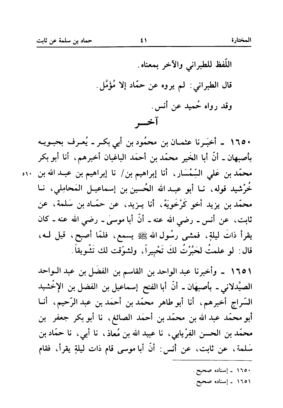 ١٦٥٠ - أَخْبَرَنَا عُثْمَانُ بْنُ مَحْمُودِ بْنِ أَبِي بَكْرٍ - يُعْرَفُ بِحَبُّوَيْهِ بِأَصْبَهَانَ - أَنَّ أَبَا الْخَيْرِ مُحَمَّدَ بْنَ أَحْمَدَ الْبَاغْبَانَ أَخْبَرَهُمْ، أَنَا أَبُو بَكْرٍ مُحَمَّدُ بْنُ عَلِيٍّ السِّمْسَارُ، أَنَا إِبْرَاهِيمُ بْنُ عَبْدِ اللهِ بْنِ خُرْشَيْدَ قَوْلَهُ، نَا أَبُو عَبْدِ اللهِ الْحُسَيْنُ بْنُ إِسْمَاعِيلَ الْمَحَامِلِيُّ، نَا مُحَمَّدُ بْنُ يَزِيدَ أَخُو كَرْخَوَيْهِ، أَنَا يَزِيدُ، عَنْ حَمَّادِ بْنِ سَلَمَةَ، عَنْ ثَابِتٍ، عَنْ أَنَسٍ رَضِيَ اللهُ عَنْهُ «أَنَّ أَبَا مُوسَى رَضِيَ اللهُ عَنْهُ كَانَ يَقْرَأُ ذَاتَ لَيْلَةٍ، فَمَشَى رَسُولُ اللهِ - صَلَّى اللهُ عَلَيْهِ وَسَلَّمَ - يَسْمَعُ، فَلَمَّا أَصْبَحَ قِيَلَ لَهُ، قَالَ: لَوْ عَلِمْتُ لَحَبَّرْتُ لَكَ تَحْبِيرًا وَلَشَوَّقْتُ لَكَ تَشْوِيقًا.»
