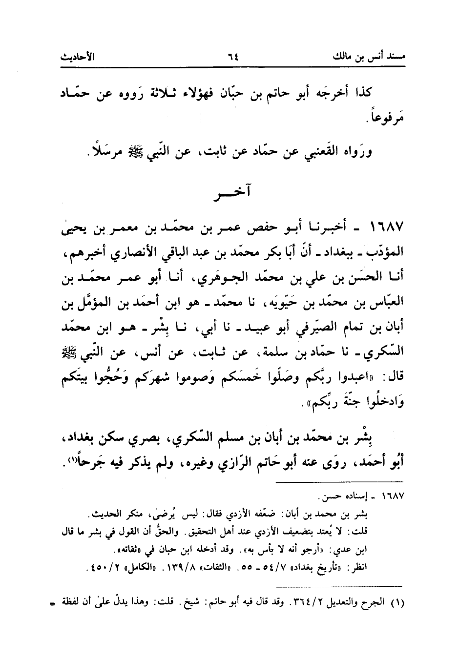 ١٦٨٧ - أَخْبَرَنَا أَبُو حَفْصٍ عُمَرُ بْنُ مُحَمَّدِ بْنِ مَعْمَرِ بْنِ يَحْيَى الْمُؤَدِّبُ - بِبَغْدَادَ - أَنَّ أَبَا بَكْرٍ مُحَمَّدَ بْنَ عَبْدِ الْبَاقِي الْأَنْصَارِيَّ أَخْبَرَهُمْ، أَنَا الْحَسَنُ بْنُ عَلِيِّ بْنِ مُحَمَّدٍ الْجَوْهَرِيُّ، أَنَا أَبُو عُمَرَ مُحَمَّدُ بْنُ الْعَبَّاسِ بْنِ مُحَمَّدِ بْنِ حَيُّوَيْهِ، نَا مُحَمَّدٌ - هُوَ ابْنُ أَحْمَدَ بْنِ الْمُؤَمَّلِ بْنِ أَبَانَ بْنِ تَمَّامٍ الصَّيْرَفِيُّ أَبُو عُبَيْدٍ - نَا أَبِي، نَا بِشْرٌ - هُوَ ابْنُ مُحَمَّدٍ السُّكَّرِيُّ - نَا حَمَّادُ بْنُ سَلَمَةَ، عَنْ ثَابِتٍ، عَنْ أَنَسٍ، عَنِ النَّبِيِّ - صَلَّى اللهُ عَلَيْهِ وَسَلَّمَ - قَالَ: «اعْبُدُوا رَبَّكُمْ، وَصَلُّوا خَمْسَكُمْ، وَصُومُوا شَهْرَكُمْ، وَحُجُّوا بَيْتَكُمْ، وَادْخُلُوا جَنَّةَ رَبِّكُمْ».