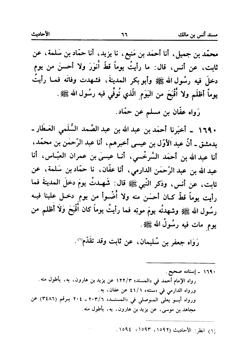 ١٦٩٠ - أَخْبَرَنَا أَحْمَدُ بْنُ عَبْدِ اللهِ بْنِ عَبْدِ الصَّمَدِ السُّلَمِيُّ الْعَطَّارُ - بِدِمَشْقَ - أَنَّ عَبْدَ الْأَوَّلِ بْنَ عِيسَى أَخْبَرَهُمْ، أَنَا عَبْدُ الرَّحْمَنِ بْنُ مُحَمَّدٍ، أَنَا عَبْدُ اللهِ بْنُ أَحْمَدَ السَّرَخْسِيُّ، أَنَا عِيسَى بْنُ عِمْرَانَ الْعَبَّاسُ (¬١)، أَنَا عَبْدُ اللهِ بْنُ عَبْدِ الرَّحْمَنِ الدَّارِمِيُّ، أَنَا عَفَّانُ، نَا حَمَّادُ بْنُ سَلَمَةَ، عَنْ ثَابِتٍ، عَنْ أَنَسٍ، وَذَكَرَ النَّبِيَّ - صَلَّى اللهُ عَلَيْهِ وَسَلَّمَ - قَالَ: «شَهِدْتُ يَوْمَ دَخَلَ الْمَدِينَةَ فَمَا رَأَيْتُ يَوْمًا قَطُّ كَانَ أَحْسَنَ مِنْهُ، وَلَا أَضْوَأَ مِنْ يَوْمٍ دَخَلَ عَلَيْنَا فِيهِ رَسُولُ اللهِ - صَلَّى اللهُ عَلَيْهِ وَسَلَّمَ -، وَشَهِدْتُهُ يَوْمَ مَوْتِهِ فَمَا رَأَيْتُ يَوْمًا كَانَ أَقْبَحَ وَلَا أَظْلَمَ مِنْ يَوْمٍ مَاتَ فِيهِ رَسُولُ اللهِ - صَلَّى اللهُ عَلَيْهِ وَسَلَّمَ -».