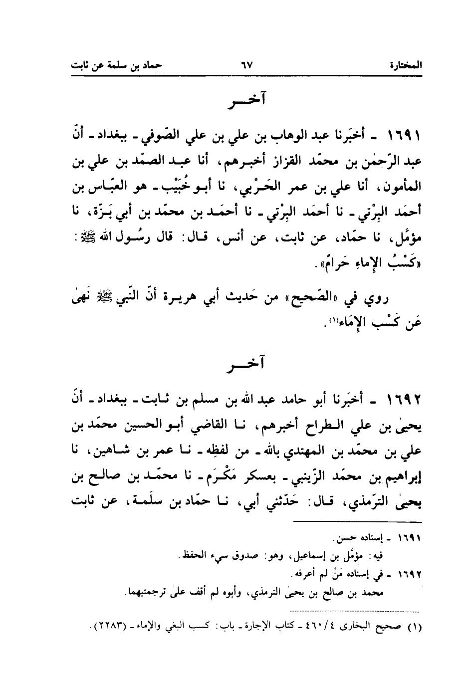 أَخْبَرَنَا عَبْدُ الْوَهَّابِ بْنُ عَلِيِّ بْنِ عَلِيٍّ الصُّوفِيُّ - بِبَغْدَادَ - أَنَّ عَبْدَ الرَّحْمَنِ بْنَ مُحَمَّدٍ الْقَزَّازَ أَخْبَرَهُمْ، أَنَا عَبْدُ الصَّمَدِ بْنُ عَلِيِّ بْنِ الْمَأْمُونِ، أَنَا عَلِيُّ بْنُ عُمَرَ الْحَرْبِيُّ، نَا أَبُو خُبَيْبٍ - هُوَ الْعَبَّاسُ بْنُ أَحْمَدَ الْبِرْتِيُّ - نَا أَحْمَدُ الْبِرْتِيُّ، نَا أَحْمَدُ بْنُ مُحَمَّدِ بْنِ أَبِي بَزَّةَ، نَا مُؤَمَّلٌ، نَا حَمَّادٌ، عَنْ ثَابِتٍ، عَنْ أَنَسٍ، قَالَ: قَالَ رَسُولُ اللهِ - صَلَّى اللهُ عَلَيْهِ وَسَلَّمَ -: «كَسْبُ الْإِمَاءِ حَرَامٌ».
