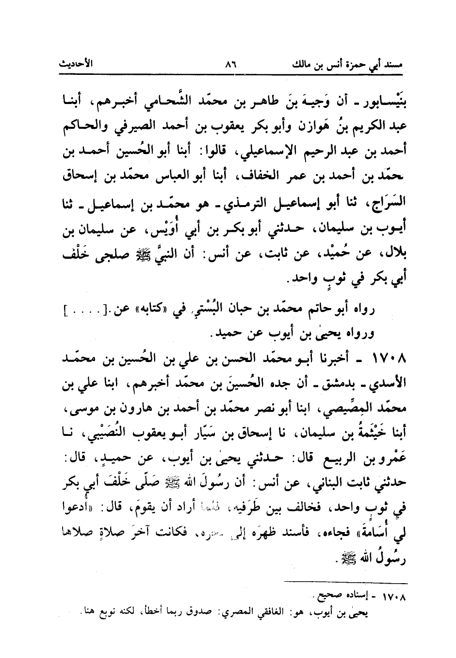 ١٧٠٨ - أَخْبَرَنَا أَبُو مُحَمَّدٍ الْحَسَنُ بْنُ عَلِيِّ بْنِ الْحُسَيْنِ بْنِ مُحَمَّدٍ الْأَسَدِيُّ - بِدِمَشْقَ - أَنَّ جَدَّهُ الْحُسَيْنَ بْنَ مُحَمَّدٍ أَخْبَرَهُمْ، أَبْنَا عَلِيُّ بْنُ مُحَمَّدٍ الْمِصِّيصِيُّ، أَبْنَا أَبُو نَصْرٍ مُحَمَّدُ بْنُ أَحْمَدَ بْنِ هَارُونَ بْنِ مُوسَى، أَبْنَا خَيْثَمَةُ بْنُ سُلَيْمَانَ، نَا إِسْحَاقُ بْنُ سَيَّارٍ أَبُو يَعْقُوبَ النَّصِيبِيُّ، نَا عَمْرُو بْنُ الرَّبِيعِ، قَالَ: حَدَّثَنِي يَحْيَى بْنُ أَيُّوبَ، عَنْ حُمَيْدٍ، قَالَ: حَدَّثَنِي ثَابِتٌ الْبُنَانِيُّ، عَنْ أَنَسٍ «أَنَّ رَسُولَ اللهِ - صَلَّى اللهُ عَلَيْهِ وَسَلَّمَ - صَلَّى خَلْفَ أَبِي بَكْرٍ فِي ثَوْبٍ وَاحِدٍ فَخَالَفَ بَيْنَ طَرَفَيْهِ، فَلَمَّا أَرَادَ أَنْ يَقُومَ، قَالَ: ادْعُوا لِي أُسَامَةَ، فَجَاءَهُ فَأَسْنَدَ ظَهْرَهُ إِلَى نَحْرِهِ، فَكَانَتْ آخِرَ صَلَاةٍ صَلَّاهَا رَسُولُ اللهِ - صَلَّى اللهُ عَلَيْهِ وَسَلَّمَ -».